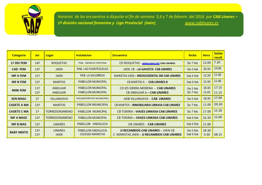 El domingo el cadete masculino A Remolques Marchal CAB Linares viaja a Martos y el mini femenino a Andújar a enfrentarse con su equipo A. El equipo de 1ª Nacional Femenina www.aove.net CAB Linares intentará lograr una victoria en su visita a Roquetas y cerrará la jornada el cadete masculino C Viajes Linkasa CAB Linares que se desplaza a primera hora de la tarde a Torredonjimeno.