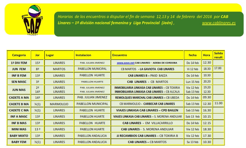 El domingo por la mañana el cadete masculino A Remolques Marchal CAB Linares juega su partido de la jornada ante Úbeda. A continuación, el infantil femenino B juega ante Baeza y el infantil masculino B disputa su encuentro ante Villacarrillo. Cierra la jornada de domingo nuestro equipo de 1ª Nacional Femenina www.aove.net CAB Linares ante ADEBA de Córdoba.
