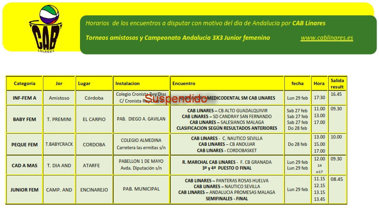 A continuación un resumen de los horarios detallados de estos encuentros, así como la fase final autonómica de la competición 3x3 U18 que organiza la Federación Andaluza de Baloncesto y para la que se clasificó, como campeón provincial, nuestro equipo femenino formado por Carla, Manola, María José y Lidia.