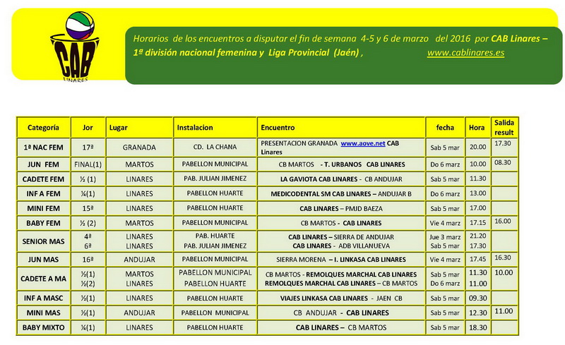 El viernes por la tarde el junior masculino Inmobiliaria Linkasa CAB Linares viaja a Andújar a disputar su partido ante el equipo B de Andújar, en el que es importante la victoria para seguir aspirando a participar en el Campeonato de Andalucía. El baby femenino viaja también en la tarde del viernes, en este caso a Martos, para disputar el segundo encuentro de la eliminatoria semifinal.