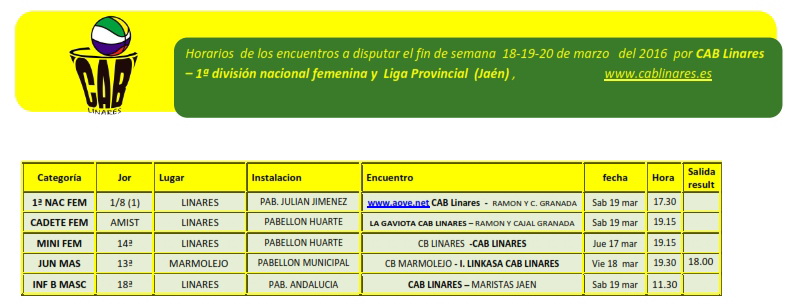 El sábado por la mañana el infantil masculino B disputa su encuentro de la jornada ante Maristas Jaén. Ya por la tarde, el equipo de 1ª Nacional Femenina www.aove.net CAB Linares juega el primer partido de octavos de final de su competición ante Ramón y Cajal de Granada. A continuación el cadete femenino La Gaviota CAB Linares disputará un encuentro de carácter amistoso ante Ramón y Cajal de Granada.