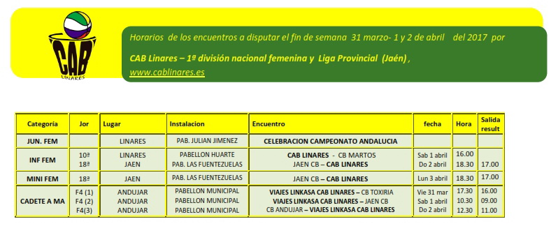 El cadete masculino, Viajes Linkasa CAB Linares disputa este fin de semana la Fase Final de la categoría en la localidad de Andújar en busca del campeonato provincial y de la clasificación para el Campeonato de Andalucía. El viernes por la tarde juega ante CB Toxiria a las 17:30. El sábado por la mañana es el turno de Jaén CB y el domingo por la mañana cerrará esta fase final con el encuentro entre los chicos de José M. García y CB Andújar.