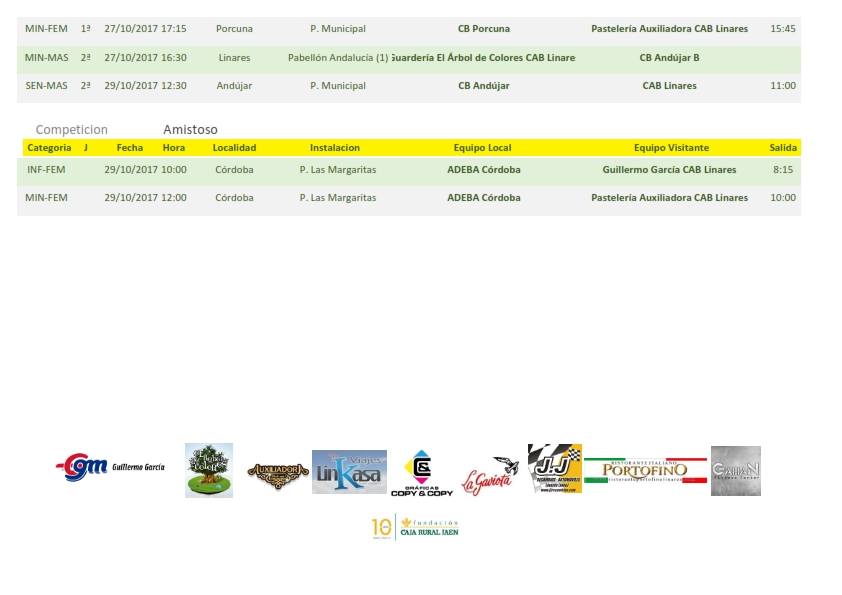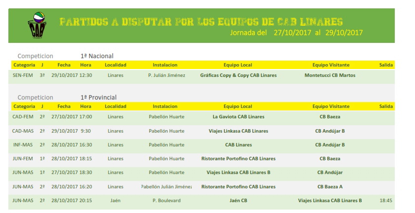 El domingo madruga el cadete masculino A Viajes Linkasa CAB Linares que disputará en el Huarte su tercer partido del fin de semana, en esta ocasión en la categoría de su edad ante el segundo equipo de CB Andújar. Los equipos infantil femenino, Guillermo García CAB Linares y mini femenino, Pastelería Auxiliadora CAB Linares, se desplazan a Córdoba a disputar sendos encuentros de carácter amistoso. Nuestro equipo senior masculino debuta en la competición en tierras iliturgitanas ante el equipo junior de CB Andújar. Termina la jornada con la disputa de la tercera jornada en la competición de 1ª Nacional Femenina, que supone el debut en casa de nuestro equipo Gráficas Copy & Copy CAB Linares que disputara el primer derbi provincial del año ante CB Martos.