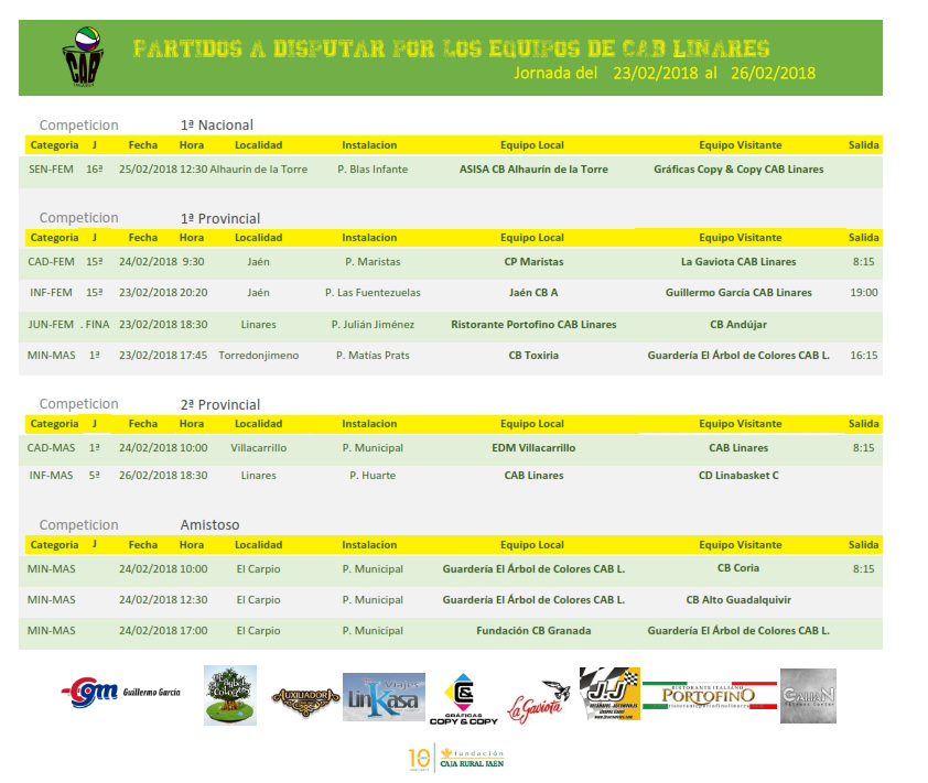 El sábado por la mañana el cadete femenino La Gaviota CAB Linares visita al Colegio Maristas de Jaén para disputar partido de liga en el que necesita la victoria para mantener la primera plaza de la liga regular alcanzada la pasada jornada. El cadete masculino B recupera la primera jornada de liga visitando Villacarrillo y el mini masculino Guardería El Árbol de Colores se desplaza a la localidad cordobesa de El Carpio para disputar un torneo amistoso invitados por CB Alto Guadalquivir.