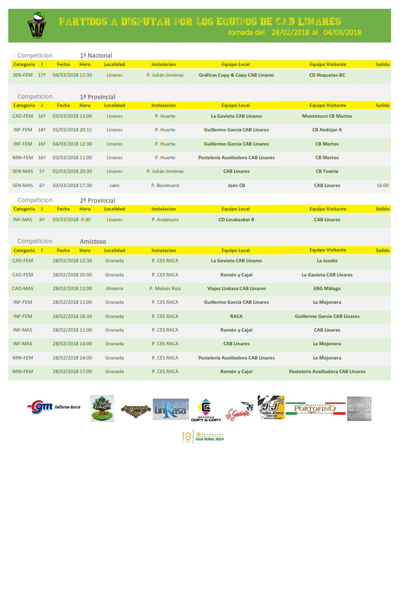 El sábado por la mañana nos trae el grueso de partidos de la jornada. A primera hora el infantil masculino de 2ª división se enfrenta como visitante a CD. Linabasket B en el P. Andalucía. En el Huarte el mini femenino, Pastelería Auxilidora CAB Linares intentará derrotar al equipo que le antecede en la clasificación, CB Martos, con el que cayeron derrotadas en el partido de ida tras disputar un prórroga. A continuación el cadete femenino La Gaviota CAB Linares disputa ante CB Martos un nuevo partido de liga en el que la victoria es imperativa para mantener la primera posición en la clasificación. El senior masculino se desplaza por la tarde a Jaén para disputar el último encuentro de la segunda fase y en el que estará en juego tan solo la segunda o tercera plaza, que a efectos prácticos es instrascendente, ya que ambos rivales se medirán de cualquier forma en la semifinal de la final a cuatro de la competición.