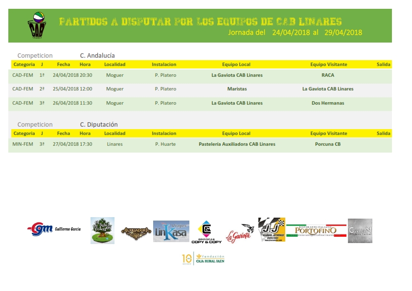 Jornada que viene marcada fundamentalmente por la participación de nuestro equipo cadete femenino La Gaviota CAB Linares en el Campeonato de Andalucía de la categoría que se está disputando en las localidades onubenses de Mazagón y Moguer. A la hora de publicación de este artículo ya han vencido en las dos primeras jornadas y están clasificadas para la eliminatoria de cuartos de final que se disputará el viernes por la mañana.