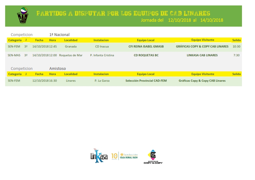 Jornada en la que tan solo se disputarán los encuentros correspondientes a la tercera jornada de 1ª Nacional, tanto en masculino como en femenino, en la que nuestros equipos actuarán como visitantes. El equipo masculino Linkasa CAB Linares viaja a Roquetas en la mañana del domingo con el objetivo de traerse de vuelta la segunda victoria de la competición. Las féminas del Gráficas Copy & Copy CAB Linares intentarán resarcirse de la derrota de la pasada semana en su visita a las instalaciones del Complejo Deportivo INACUA Antonio Prieto, donde disputa como local sus encuentros GMASB.