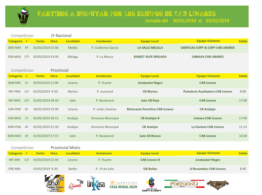 El viernes por la tarde el mini masculino viaja a Jaén para afrontar la cuarta jornada de competición ante el equipo Blanco de Jaén CB. A continuación el infantil masculino hará lo propio en las instalaciones del Pabellón Boulevard ante el equipo rojo de Jaén CB. El junior masculino Linkasa CAB Linares comienza la segunda fase de la competición provincial visitando al equipo B de CB Andújar. Primero de los seis enfrentamientos que tienen por delante los chicos de Sergio con los tres equipos junior de Andújar clasificados para esta segunda fase.