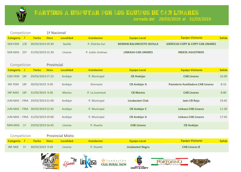 El domingo por la mañana el infantil masculino pone fin a la liga regular, de la que hace dos jornadas ya es campeón, en un partido de trámite ante CB Martos en tierras marteñas. La mañana del domingo se cerrara con la disputa de la vigesimoquinta jornada de Liga Nacional 1 masculina que enfrentará en el Julián a nuestro equipo Linkasa CAB Linares con Indese Agustinos de Granada en un partido con nada en juego para los chicos de Sergio Badillo, sin posibilidades de clasificación para los play off por el título, pero en el que intentarán dar una buena imagen y conseguir una nueva victoria.