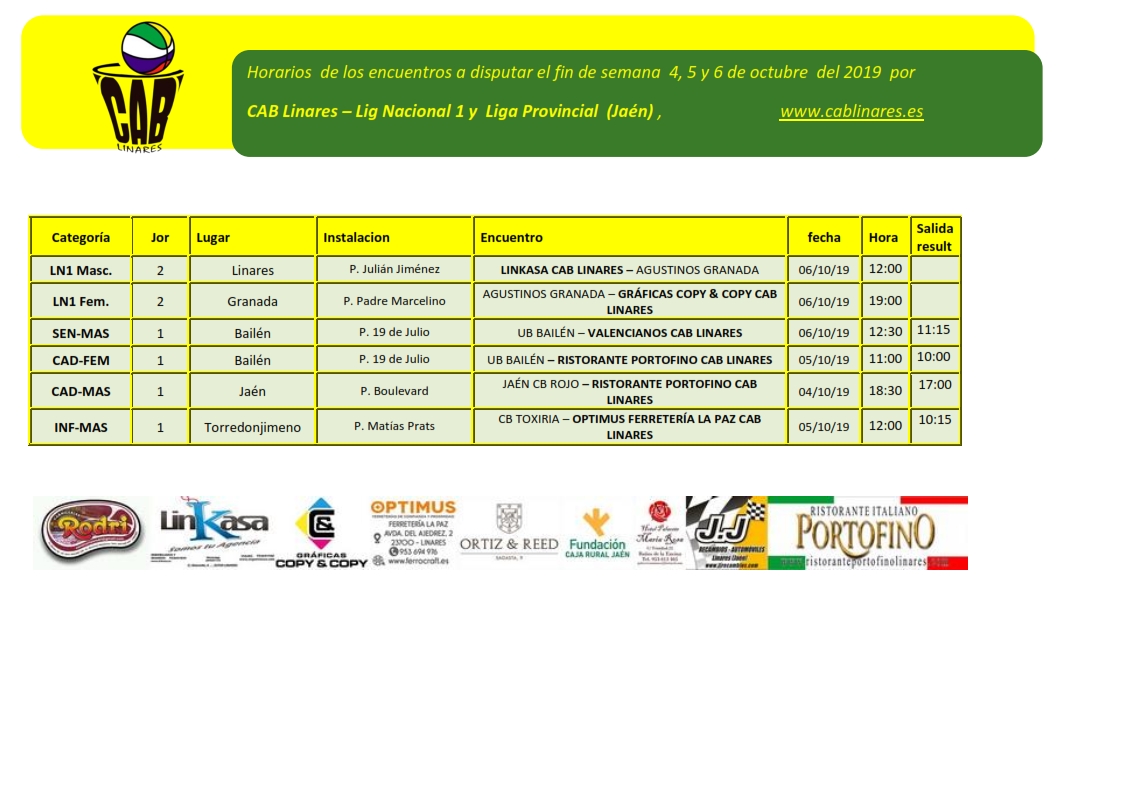 El domingo, el senior masculino provincial Valencianos CAB Linares rinde visita a UB Bailén en su debut en competición provincial. También el domingo en el Pabellón Julián Jiménez, tras descansar en la primera jornada, el equipo de Liga Nacional 1 Linkasa CAB Linares recibe a los granadinos de Agustinos. Idéntico rival para el equipo femenino, que en un horario atípico, visitará en la tarde del domingo el colegio Santo Tomás de Villanueva de Granada.