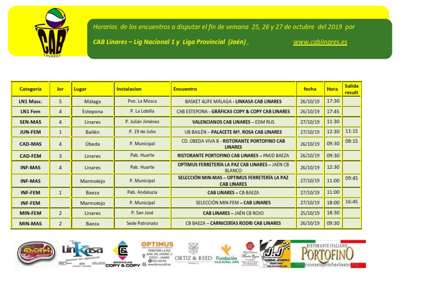 Nueva jornada de competición en Liga Nacional 1, Categorías Provinciales y Copa Diputación para los equipos de CAB Linares que en esta jornada ya cuentan con todos sus equipos en liza.