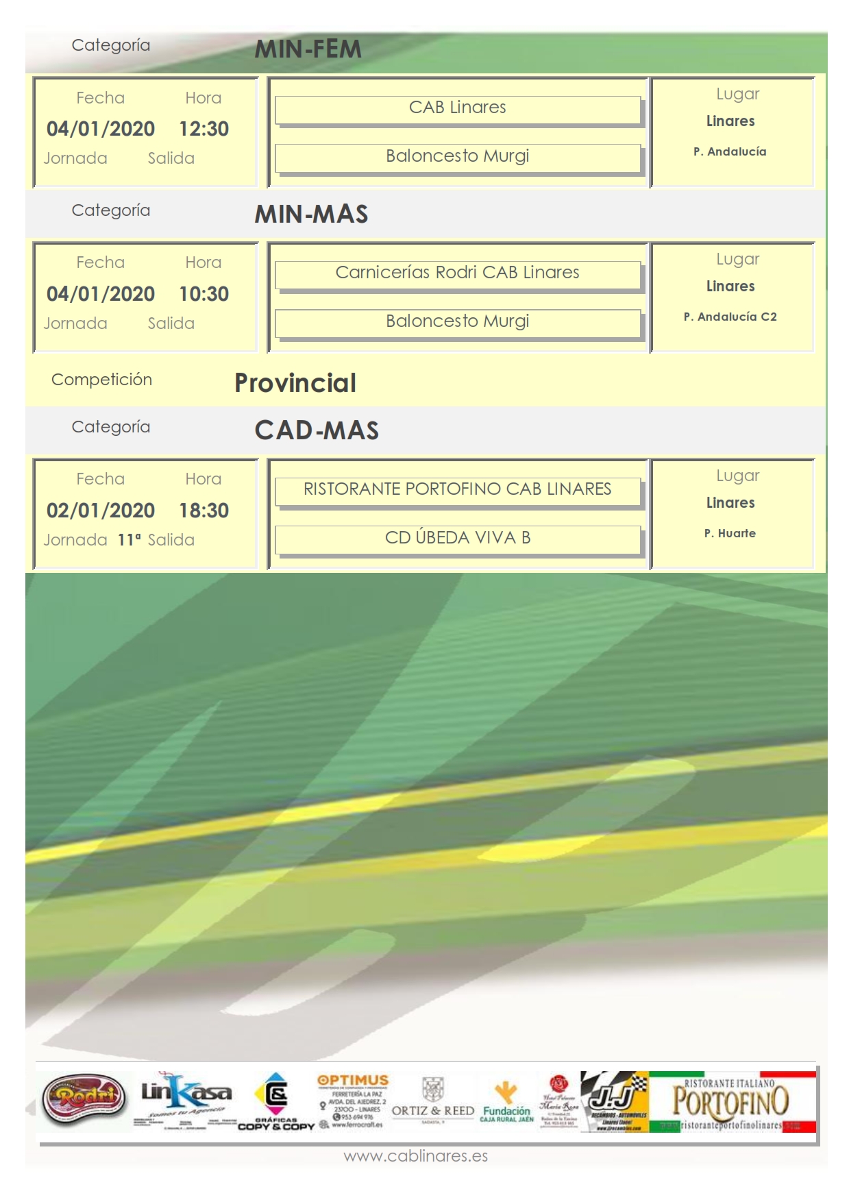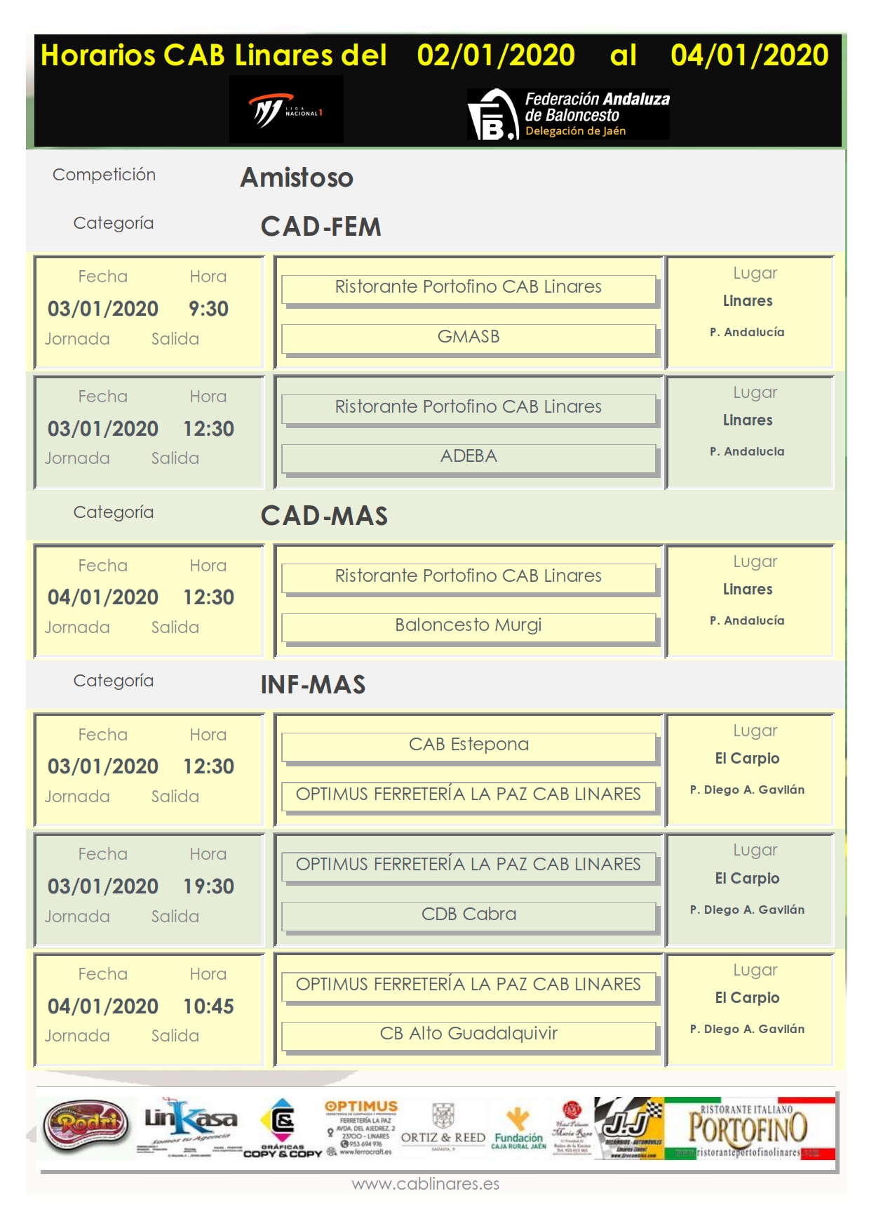 El mismo día 2 jueves, el cadete masculino Ristorante Portofino CAB Linares disputa el único partido de competición oficial, recuperando su encuentro con CD Úbeda Viva aplazado en la jornada del día 20 de diciembre a causa de las adversas condiciones climatológicas que hicieron imposible su celebración. Lo hará a partir de las 18:30 h en el Pabellón Huarte.