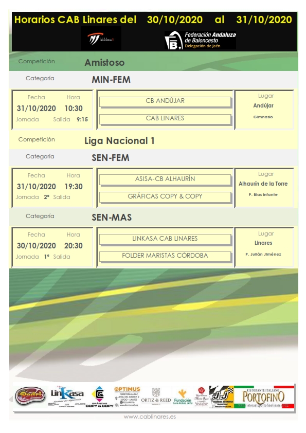 Comienza una temporada incierta para los equipos que componen CAB Linares. Sin la posibilidad de haber podido disputar ningún encuentro de carácter amistoso los equipos de Liga Nacional, tras haber tenido que aplazar los partidos correspondientes a la primera jornada de competición por diferentes motivos, disputarán este fin de semana sus primeros encuentros. El conjunto masculino Linkasa CAB Linares recibirá en la tarde del viernes a los cordobeses de Maristas, en partido que se disputará sin público debido a las restricciones impuestas por las autoridades sanitarias y locales. El equipo femenino Gráficas Copy & Copy CAB Linares viaja en la tarde del sábado a la localidad malagueña de Alhaurín de la Torre para medirse a un complicado rival que ya arrolló en la primera jornada a nuestras vecinas de Jaén CB. El sábado por la mañana nuestro equipo minibasket femenino se desplaza a Andújar donde ha sido invitado a disputar un encuentro de carácter amistoso.