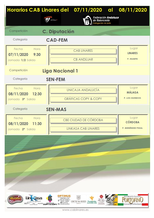 Por otro lado nuestros equipos de Liga Nacional continúan su competición disputando ambos sus partidos fuera de casa. El equipo masculino Linkasa CAB Linares visita la capital cordobesa en la mañana del domingo para enfrentarse a Ciudad de Córdoba tras la victoria en la primera jornada ante los también cordobeses de Maristas y el equipo femenino vuelve de nuevo a tierras malagueñas, en concreto a las instalaciones de los Guindos, en la capital malacitana, para disputar la tercera jornada de liga ante Unicaja Andalucía.