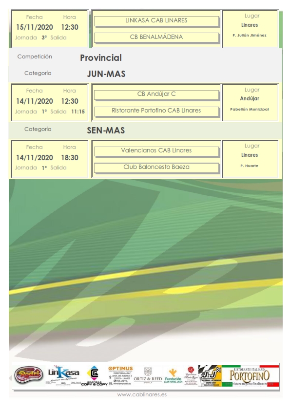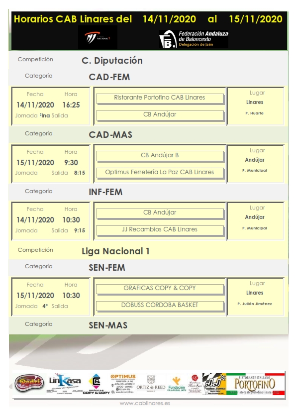 El sábado por la mañana en Andújar abre jornada el infantil femenino JJ Recambios CAB Linares que debuta ante CB Andújar en Copa Diputación. Cierra jornada matinal en Andújar el junior masculino Ristorante Portofino CAB Linares que disputará su primera jornada de liga ante el equipo C de CB Andújar.