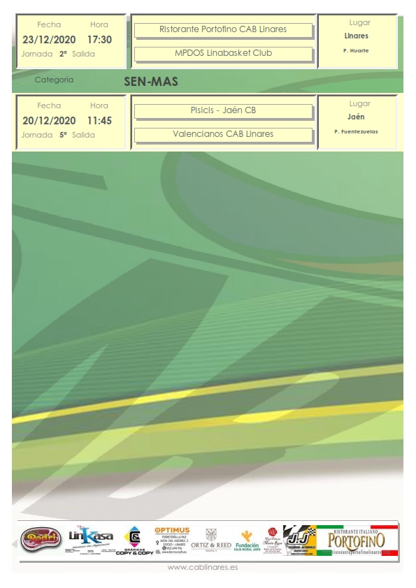 El domingo por la mañana el senior masculino provincial Valencianos CAB Linares disputa en Jaén la quinta jornada de competición con el que parece que va a ser uno de los gallitos de la competición. El mini mixto Carnicerías Rodri CAB Linares viaja a Andújar para estrenarse en competición de Copa Diputación. El equipo de Liga Nacional 1 Femenina Gráficas Copy & Copy CAB Linares se despide de la competición en este año 2020 disputando la octava jornada de competición en Estepona.