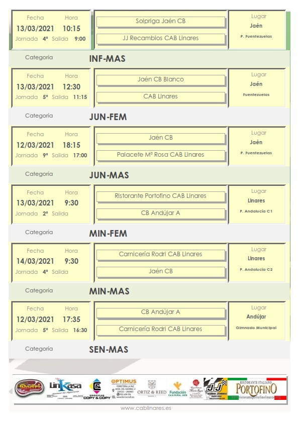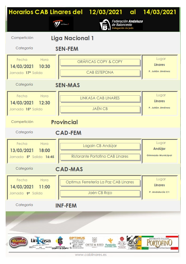 La mañana del domingo nos deja dos partidos de cantera: el mini femenino Carnicería Rodri CAB Linares que recibe la visita de Jaén CB y el cadete masculino Optimus Ferretería La Paz CAB Linares, que recibe a idéntico rival, y dos interesantes partidos de Liga Nacional 1. En el primer turno disputarán su partido las chicas de Gráficas Copy & Copy CAB Linares ante CAB Estepona. A las 12:30 derbi provincial entre nuestro equipo Linkasa CAB Linares y Jaén CB.
