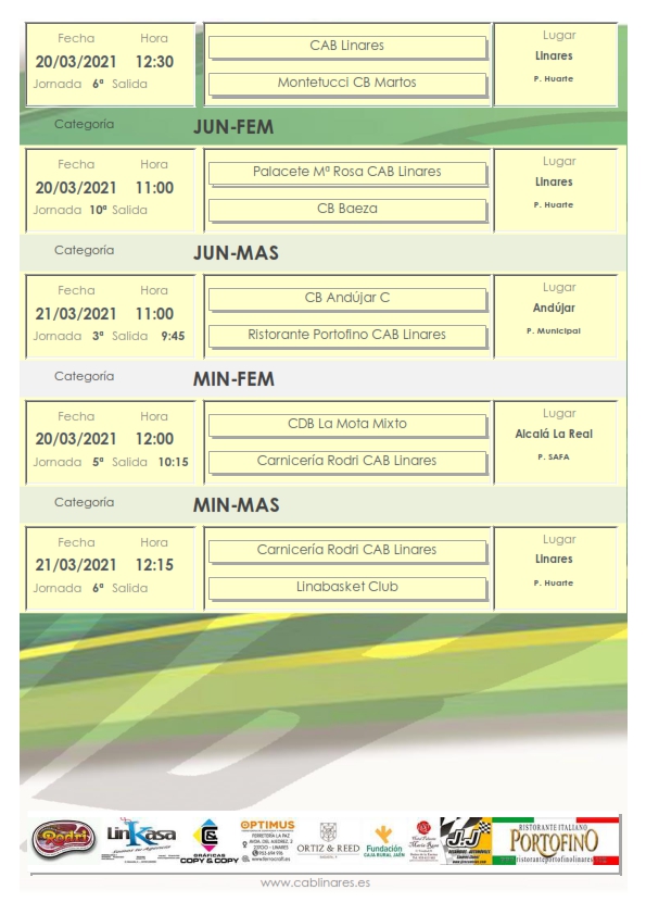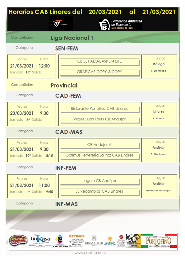 El domingo por la mañana el cadete masculino Optimus Ferretería La Paz CAB Linares visita la cancha de CB Andújar. A continuación el junior masculino Ristorante Portofino CAB Linares jugará su partido ante el equipo C iliturgitano, y a la misma hora, pero en el Gimnasio Municipal, el infantil femenino, JJ Recambios CAB Linares disputa su quinta jornada liguera ante CB Andújar. El mini masculino Carnicería Rodri CAB Linares disputa el derbi local con Linabasket Club.