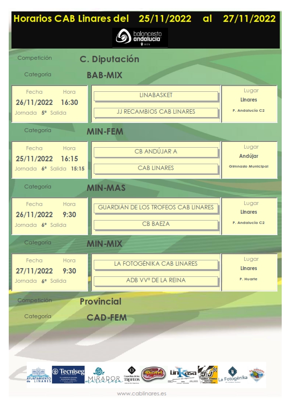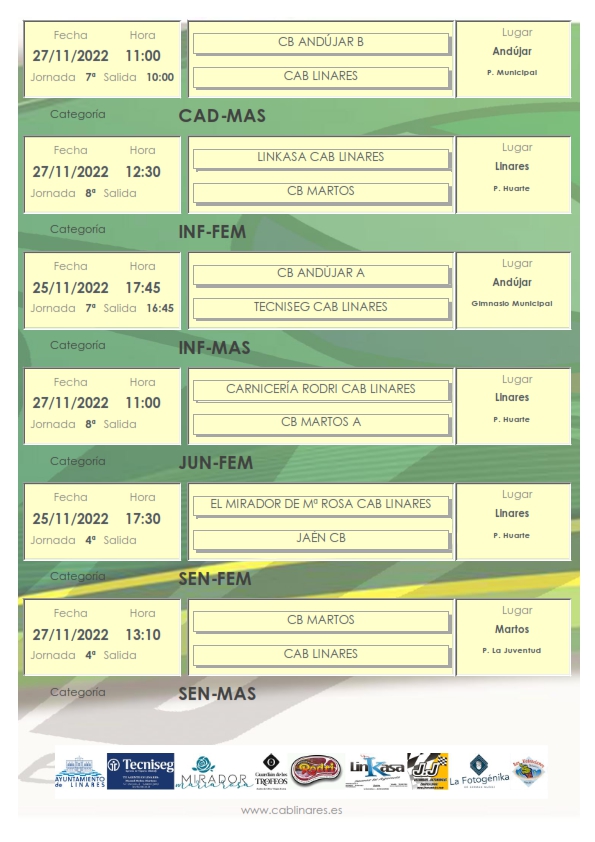 El domingo por la mañana el mini mixto La Fotogénika CAB Linares recibe la visita de ADB Villanueva de la Reina en el Huarte. En el segundo turno de partidos el infantil masculino Carnicería Rodri CAB Linares se enfrenta al equipo A de CB Martos y cierra la jornad en el Huarte el cadete masculino Linkasa CAB Linares que se medirá también al club marteño. El cadete femenino se desplaza a Andújar para enfrentarse con el equipo B iliturgitano. Concluye la jornada matinal con el partido que enfrentará al senior femenino con CB Martos en tierras marteñas.