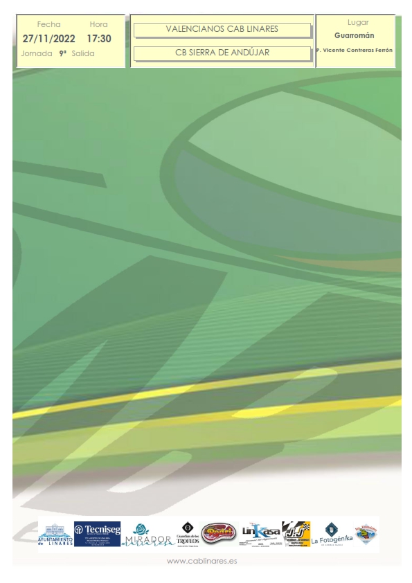 La jornada finalizará con el interesante partido senior masculino entre nuestro equipo Valencianos CAB Linares y CB Sierra de Andújar, que se disputan la primera plaza del grupo de la primera fase de la competición provincial en el Pabellón Vicente Contreras Ferrón de Guarromán.