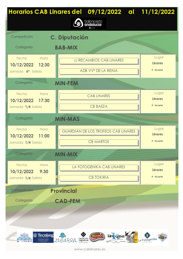 El sábado madrugan los chicos y chicas del mini mixto La Fotogénika CAB Linares, que reciben el Huarte a CB Toxiria en partido de cuartos de final de Copa Diputación. A continuación el mini masculino AOVE Guardián de los Trofeos CAB Linares recibe a CB Martos también en partido de cuartos de Copa Diputación. Cierra la jornad matinal en el Huarte el baby mixto JJ Recambios CAB Linares que se medirá con ADB Villanueva de la Reina. El junior femenino El Mirador de María Rosa CAB Linares viaja a Baeza a disputar su quinta jornada de liga regular.