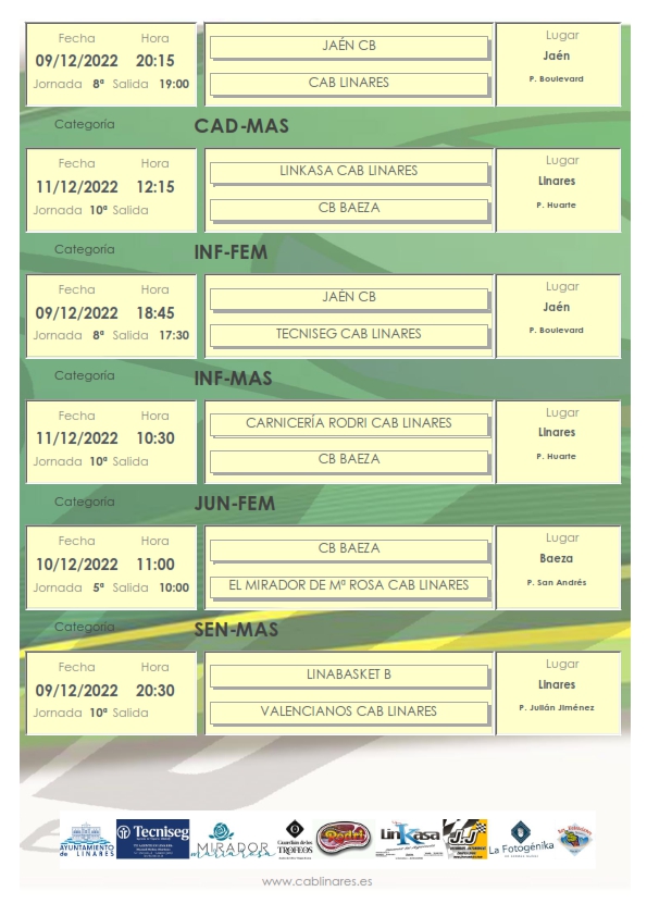 Comienza la jornada el viernes por la tarde con al disputa en Jaén de dos interesantes encuentros femeninos. El infantil, Tecniseg CAB Linares y el cadete se enfrentarán en el Boulevard a CB Jaén. El senior masculino Valencianos CAB Linares se enfrenta en el Julián Jiménez como visitante a Linabasket Rojo.