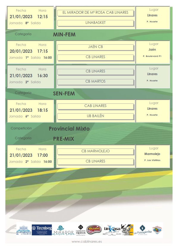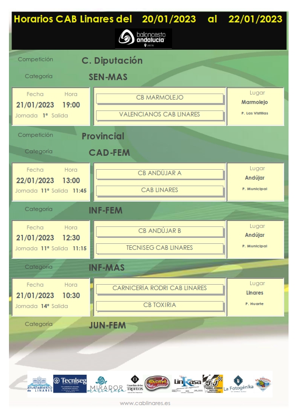 El sábado por la mañana el infantil masculino Carnicerías Rodri CAB Linares recibe en el Huarte a CB Toxiria y a continuación el junior femenino El Mirador de María Rosa CAB Linares disputa su jornada liguera ante Linabasket. El infantil femenino Tecniseg CAB Linares visita la cancha de CB Andújar B.