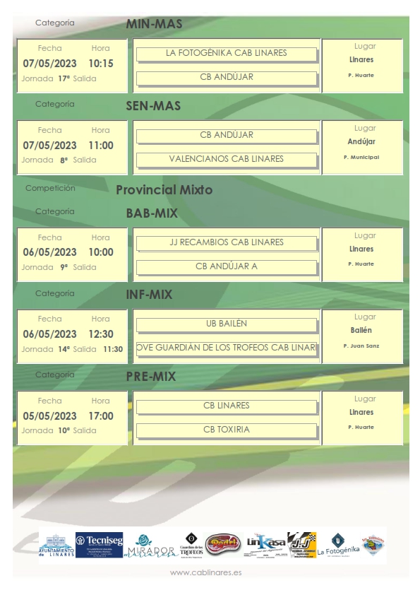 En la mañana del domingo el mini masculino La Fotogénika CAB Linares recibe a CB Andújar en el Huarte y el senior masculino Valencianos CAB Linares disputa la última jornada de liga en Andújar ante CB Andújar en un partido de trámite ya que matemáticamente se han proclamado campeones de esta segunda fase de la competición liguera. Cierra la jornada en el Huarte el senior femenino El Mirador de María Rosa CAB Linares, que disputa su tercer partido en seis días, en esta ocasión ante UB Bailén.