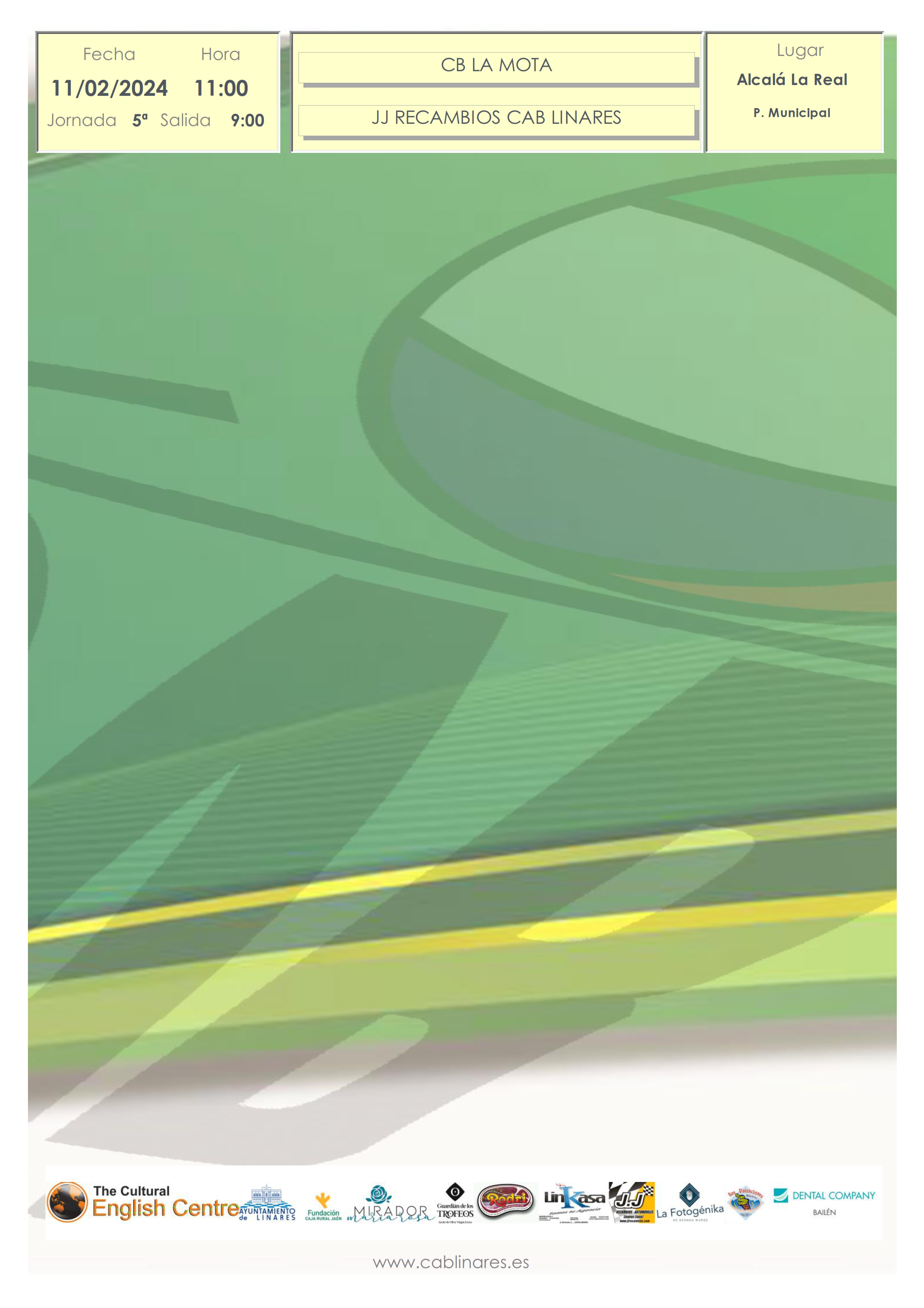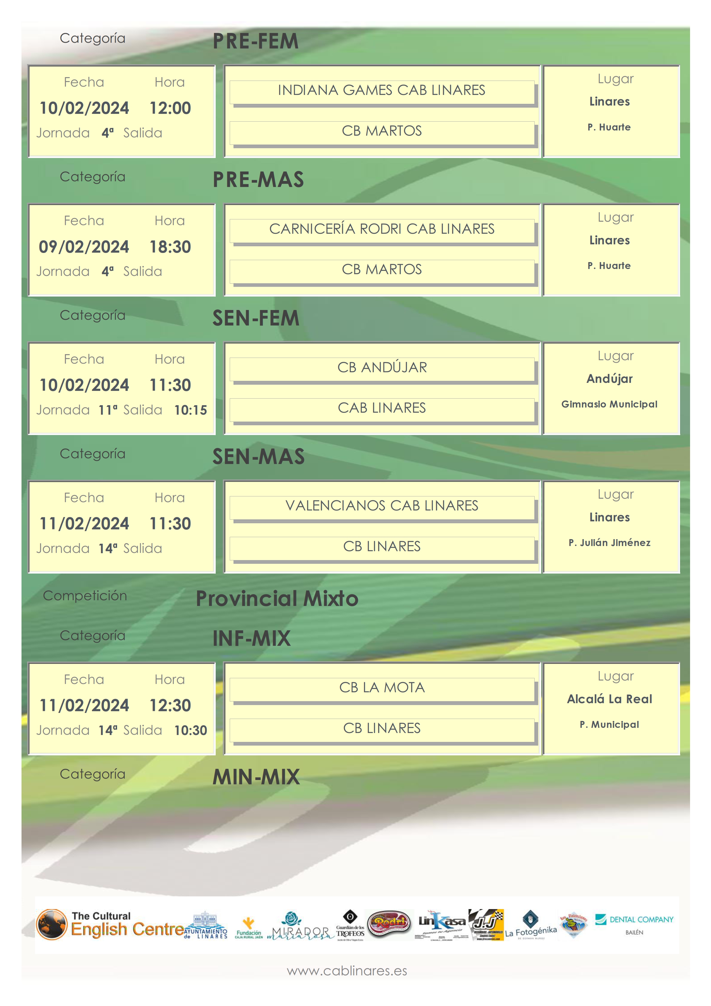 El cadete masculino Linkasa CAB Linares comienza la segunda fase de la competición liguera en tierras toxirianas. Los equipos mixtos mini, JJ Recambios CAB Linares, e infantil, CB Linares, tienen el desplazamiento más largo de la temporada, a tierras alcalainas. El senior masculino Valencianos CAB LInares cierra la primera fase de la liga en el Julián ante CB Linares.