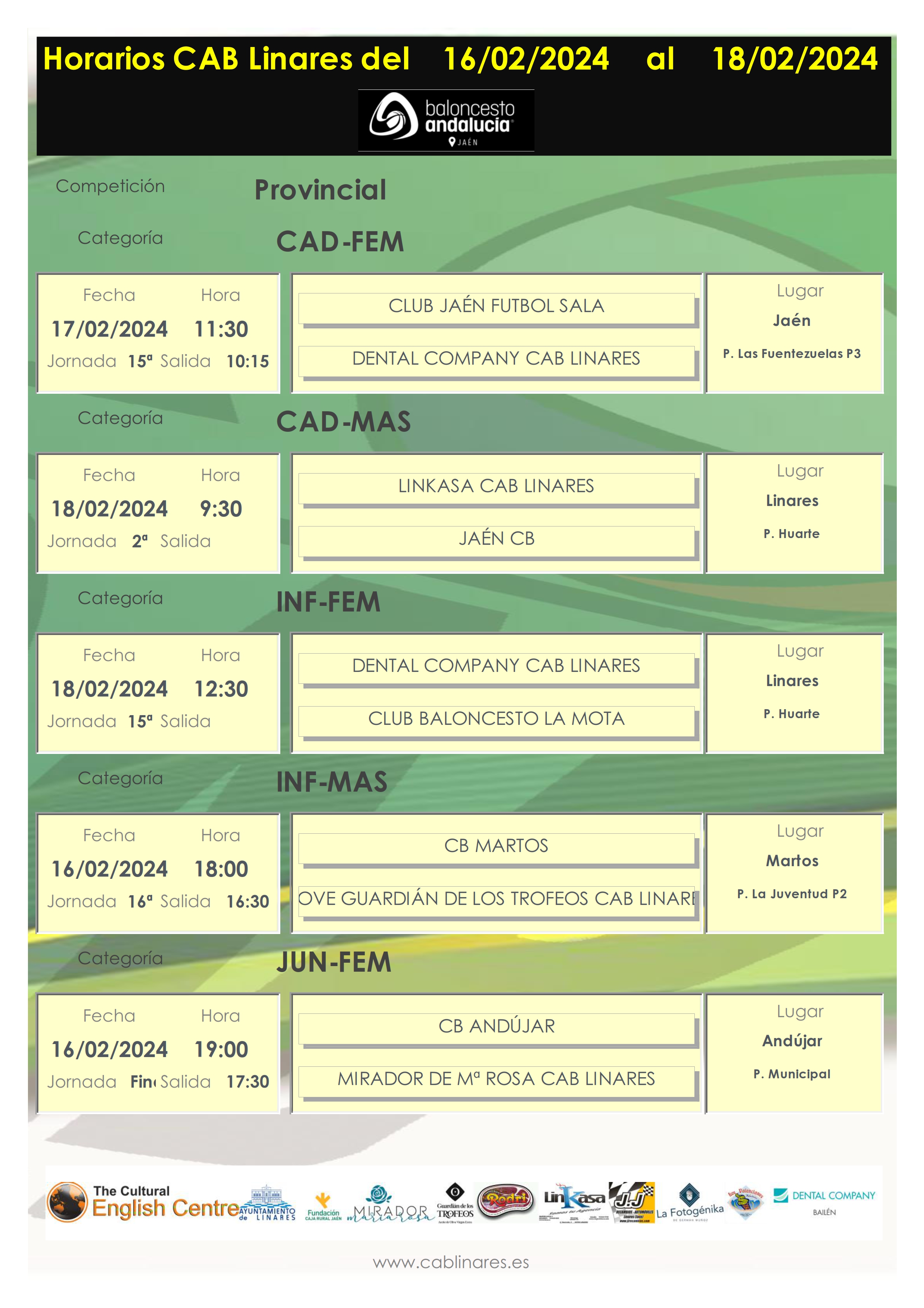 El domingo por la mañana tres partidos en el Huarte. Abre jornada el cadete masculino Linkasa CAB Linares ante Jaén CB. A continuación el senior femenino finaliza la liga regular ante el líder CB Martos y cierra la jornada el infantil femenino Dental Company CAB Linares ante CB La Mota.