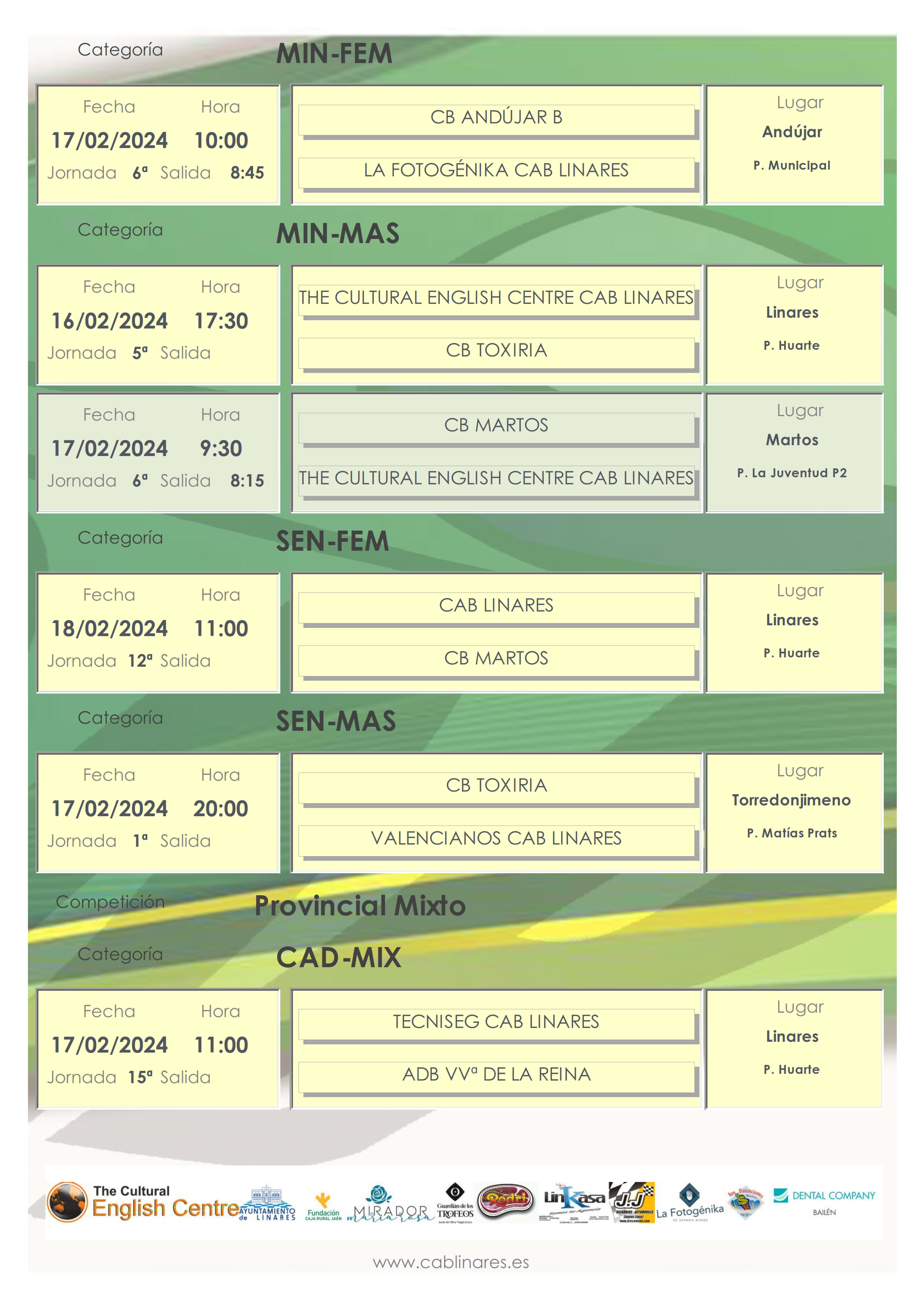 El sábado por la mañana segundo partido del fin de semana para los chicos minis de The Cultural English Centre CAB Linares que se medirán con CB Martos en la Ciudad de La Peña. El infantil mixto abre la jornada en el Huarte ante ADB Villanueva de la Reina. El mini femenino La Fotogénika CAB Linares viaja a Andújar para disputar su partido con el equipo B iliturgitano. En el segundo turno de juego en el Huarte el cadete mixto Tecniseg CAB Linares recibe al conjunto villanovero. El cadete femenino Dental Company CAB Linares rinde visita a Jaén FS y el mini mixto JJ Recambios CAB Linares cierra la mañana en el Huarte ante ADB Villanueva de la Reina.