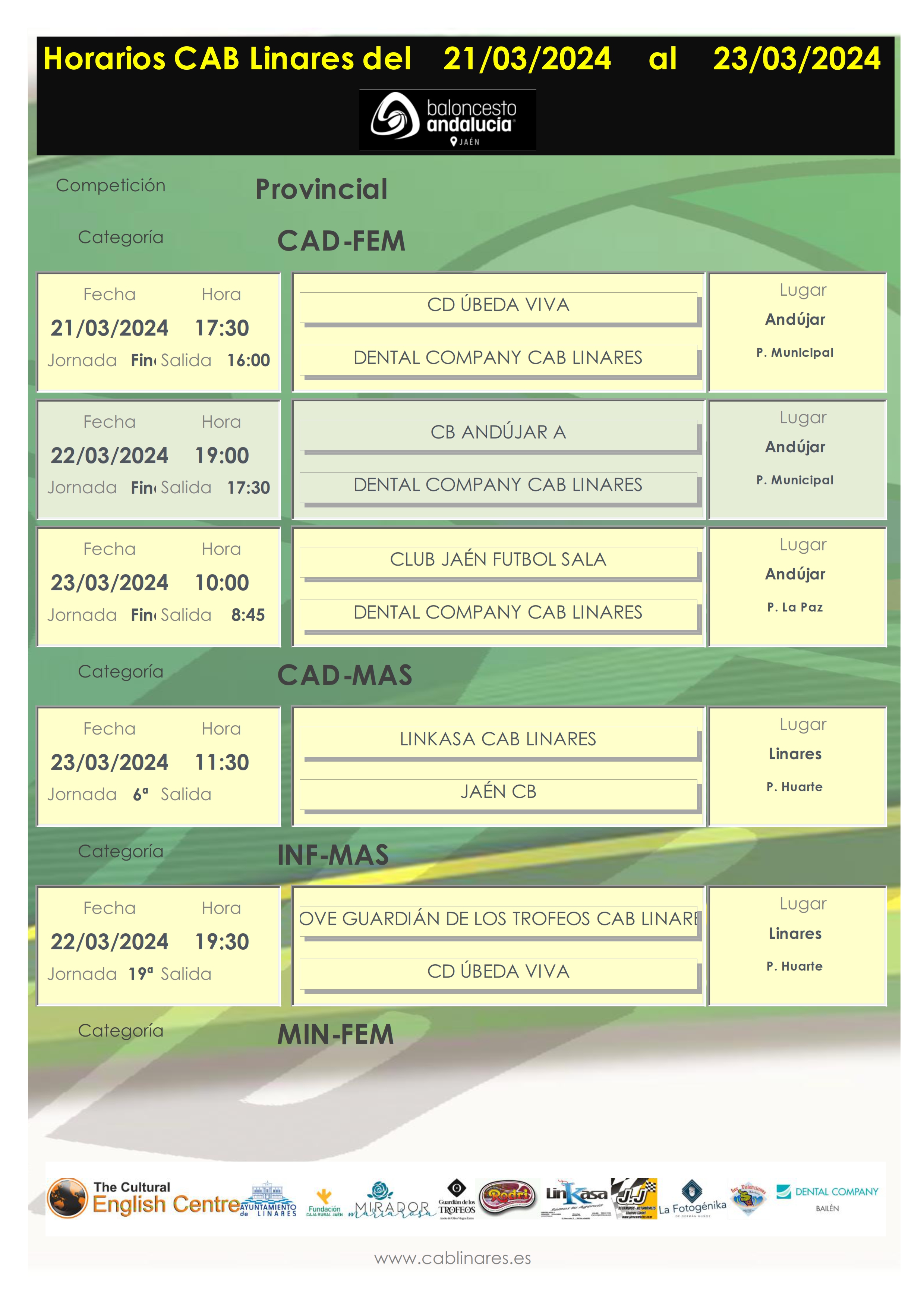 En la tarde del viernes, el mini femenino, La Fotogénika CAB Linares, visita la cancha de Jaén CB. El mini masculino, The Cultural English Centre, recibe en el Huarte a Jaén CB. Cierra la jornada en el Huarte el infantil masculino, AOVE Guardián de los Trofeos CAB Linares que disputa su encuentro de la jornada ante CD Úbeda Viva. Cierra la jornada del viernes el senior masculino, Valencianos CAB Linares que rinde visita a CB Toxiria en la tarde noche.