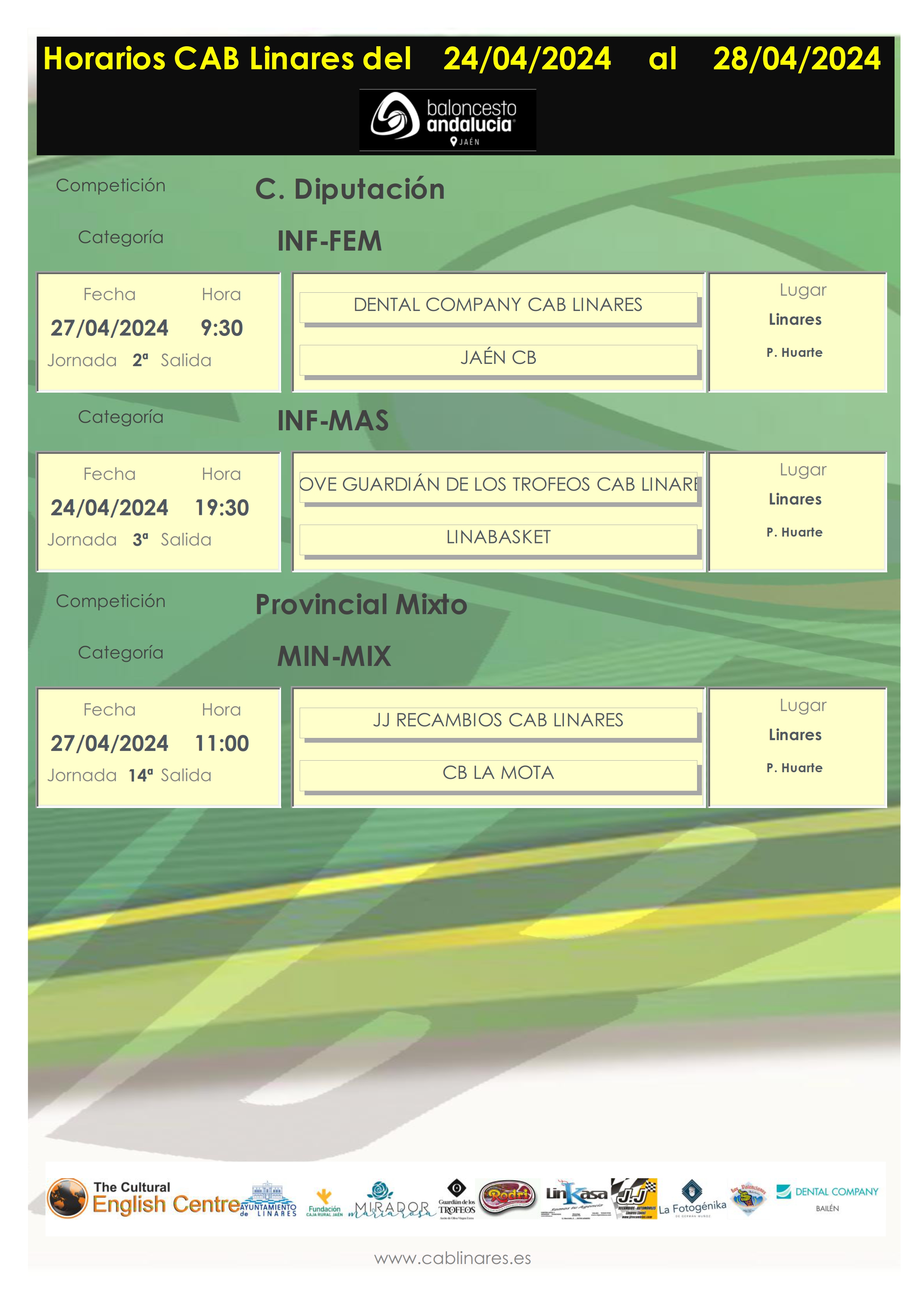 El sábado por la mañana en el Huarte dos encuentros. En el primer turno el infantil femenino disputa su partido de Copa Diputación ante Jaén CB y a continuación el mini mixto JJ Recambios CAB Linares recibe la visita de CB La Mota.