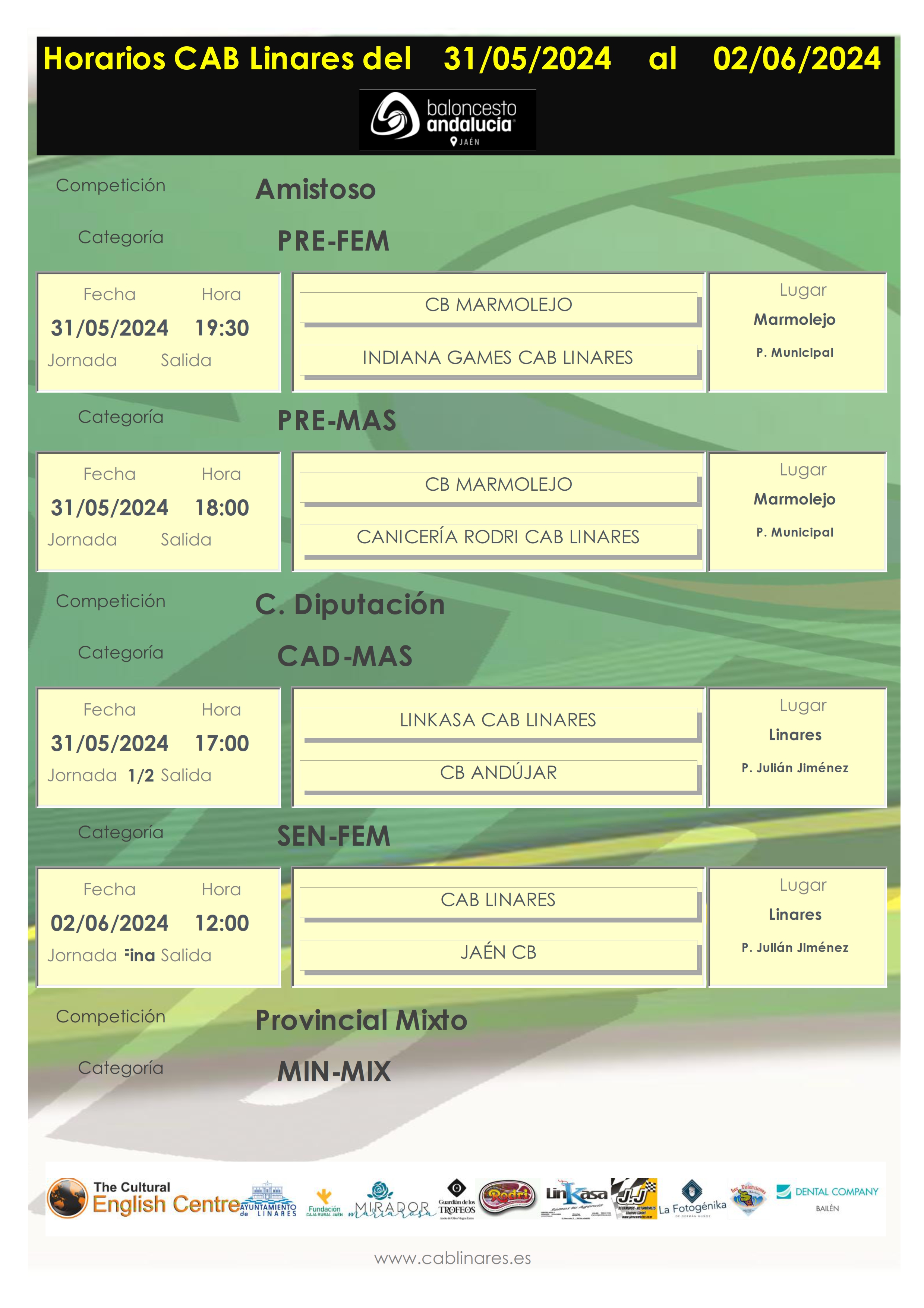El viernes por la tarde el cadete masculino Linkasa CAB Linares disputa la final a cuatro de la Copa Diputación. Su rival en el encuentro semifinal es CB Andújar. En caso de vencer se enfrentará a continuación al vencedor de la otra semifinal, que disputarán los conjuntos de Jaén CB y CB La Mota.