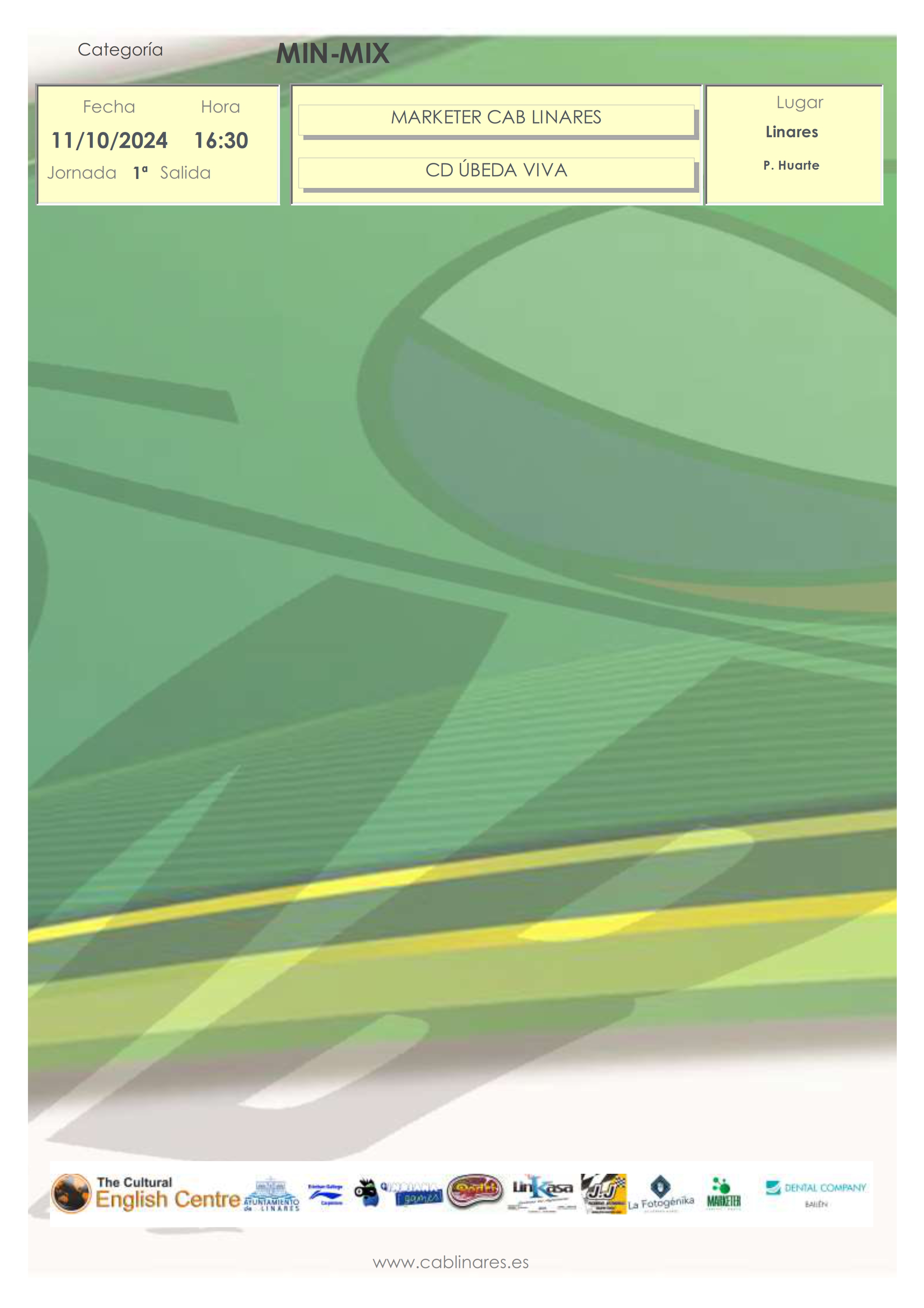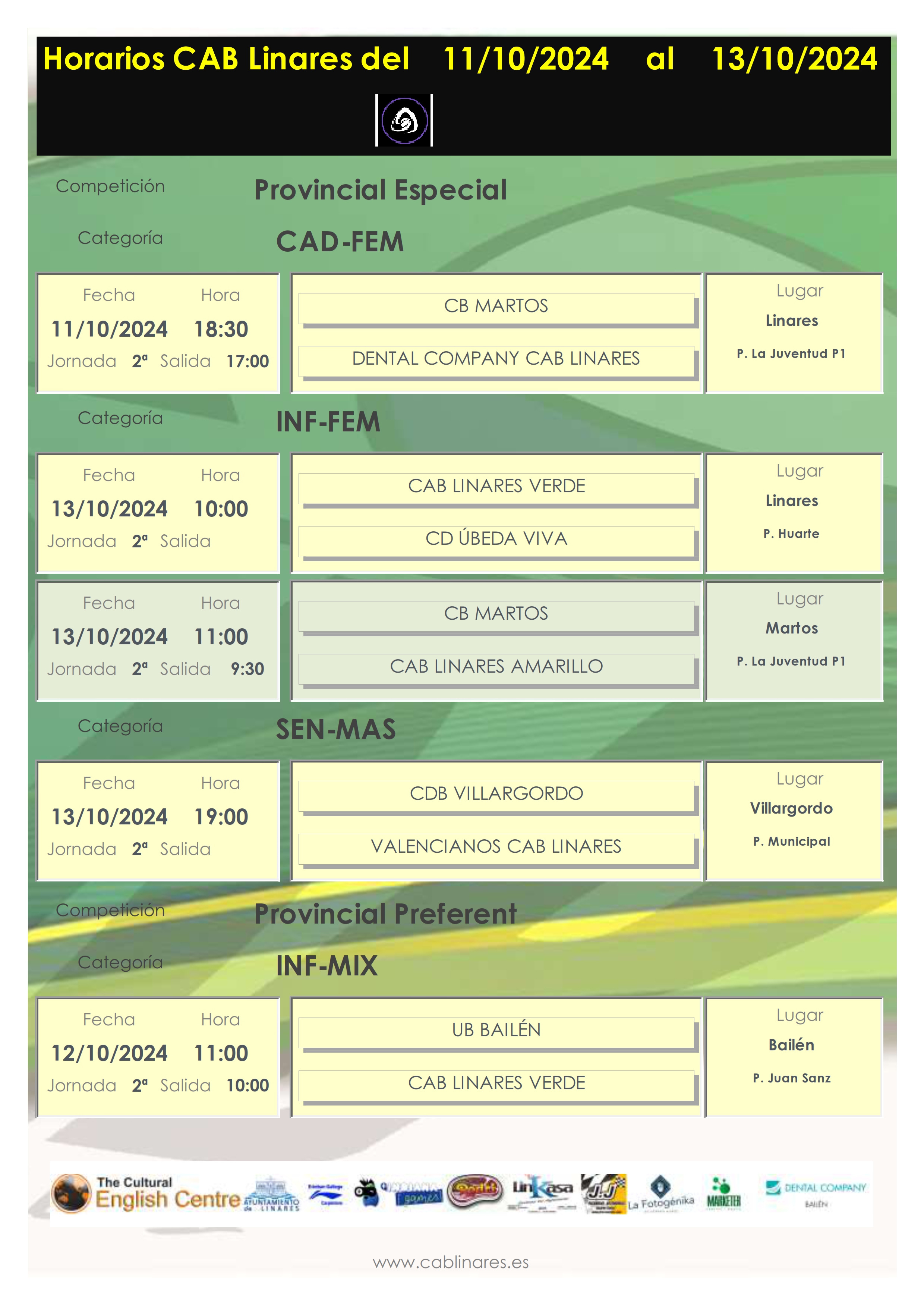 En la tarde del viernes debuta en competición el mini mixto Marketer CAB Linares que milita en la Liga Provincial Preferente y que recibe en el Huarte a CD Úbeda Viva. También en la tarde del viernes el cadete femenino, Dental Company CAB Linares, se desplaza a Martos a disputar la segunda jornada liguera.