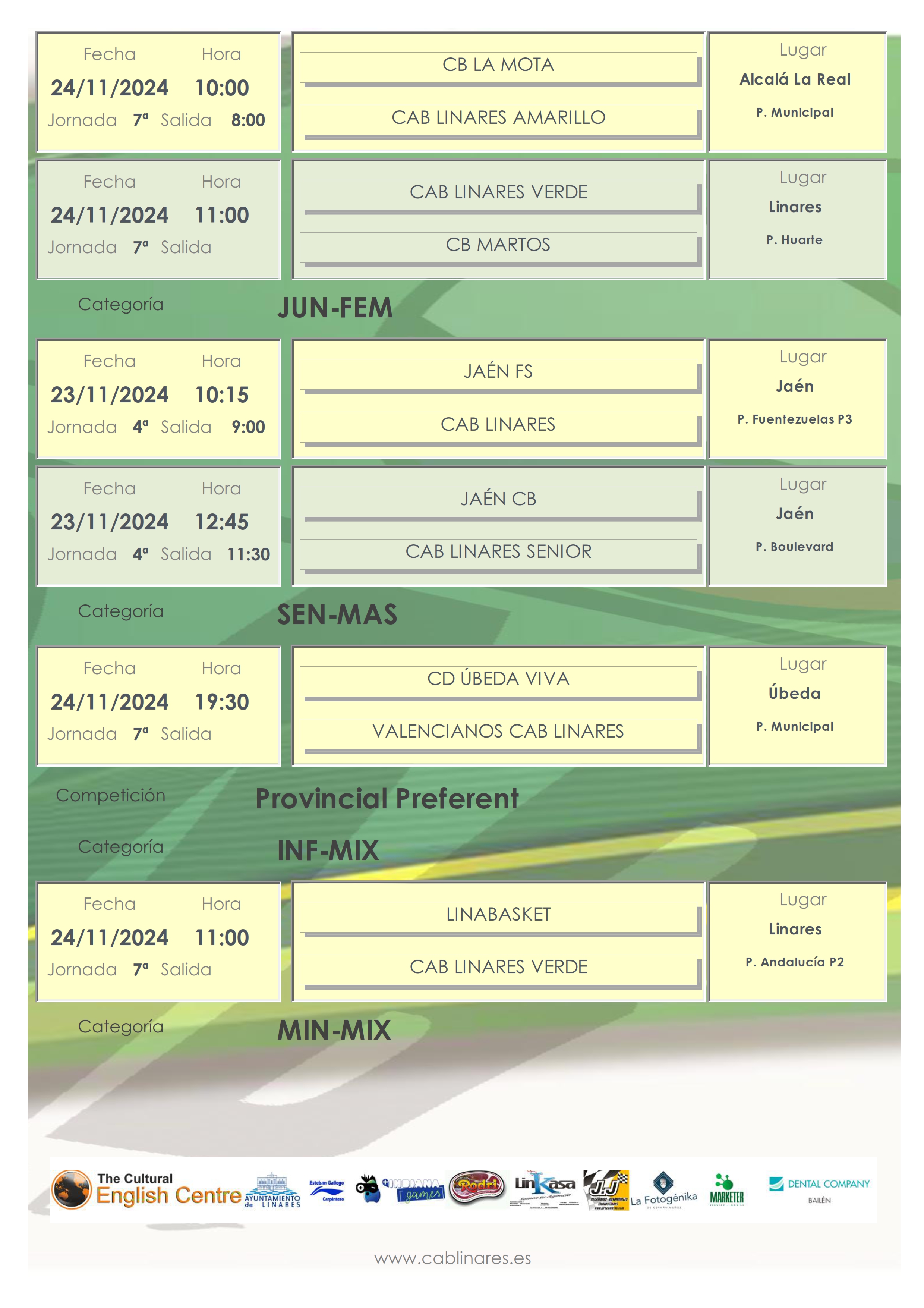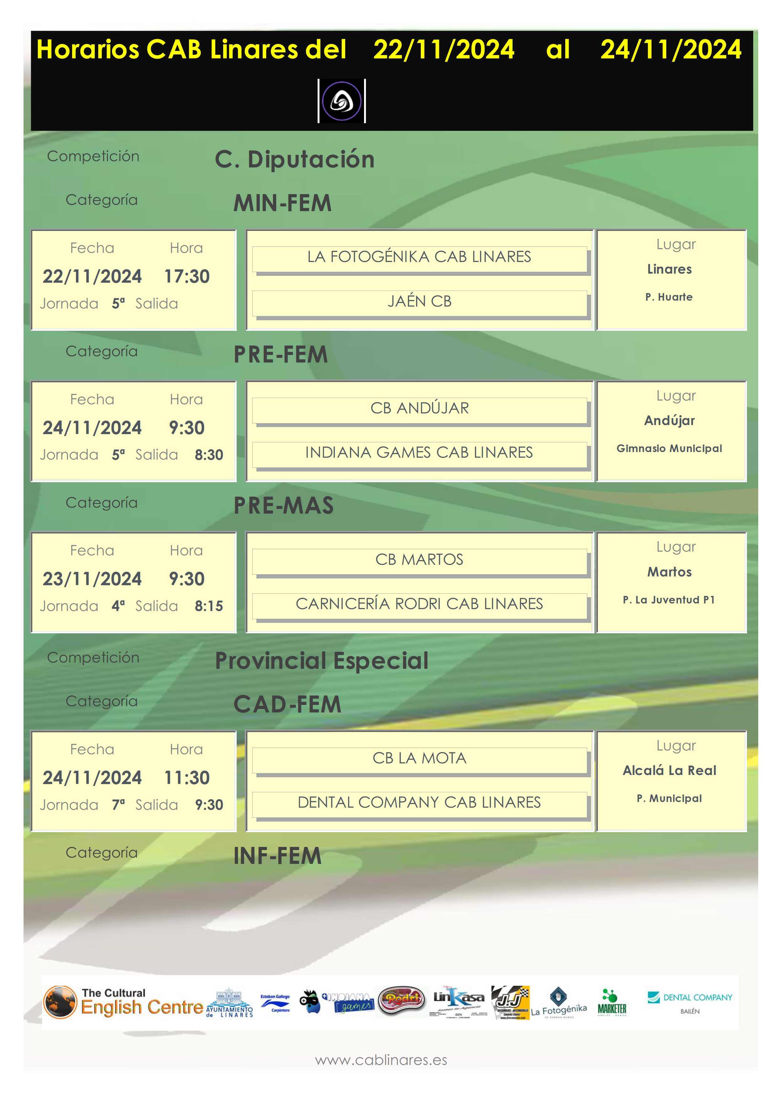 La jornada viene intensa el domingo. El premini femenino Indiana Games CAB Linares viaja a Andújar. En el Huarte el mini mixto Marketer CAB Linares disputa el derbi local con Linabasket. A continuación el infantil femenino verde recibe a CB Martos. Cierra la jornada en Linares el infantil mixto que disputa su partido en el Andalucía con Linabasket. En Alcalá la Real el infantil femenino amarillo disputa su partido de la jornada y a continuación las chicas del cadete femenino Dental Company CAB Linares hacen lo propio midiéndose a CB La Mota.
