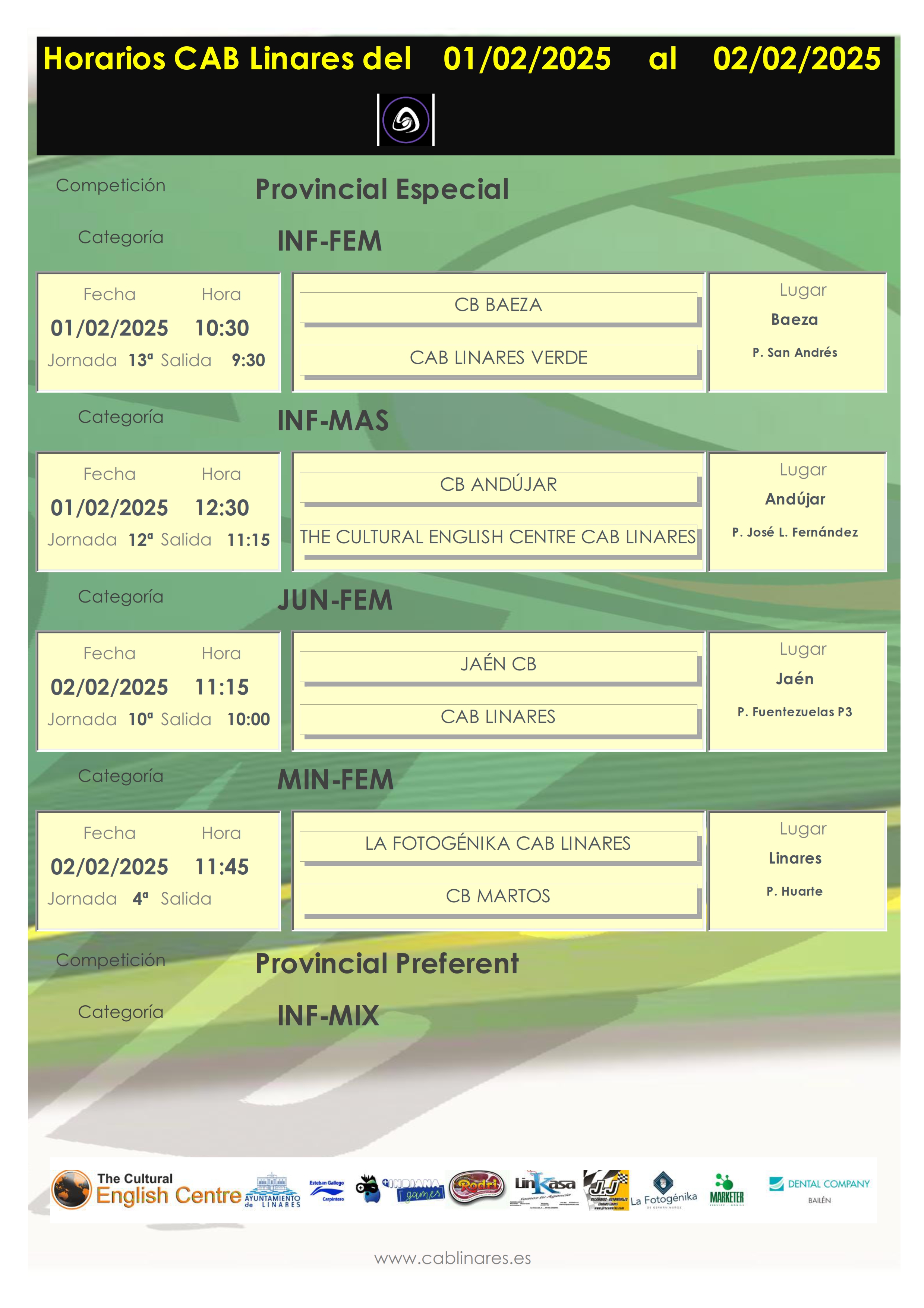 En la mañana del domingo el premini mixto Carnicería Rodri CAB Linares recibe en el Huarte a Jaén CB. A continuación el mini femenino La Fotogénika CAB Linares disputa su partido ante CB Martos. En Jaén, el junior femenino, Tecniseg CAB Linares, disputa la última jornada de liga regular ante Jaén CB en busca de la segunda plaza de cara a la fase final que comenzará a disputarse a mediados de febrero.