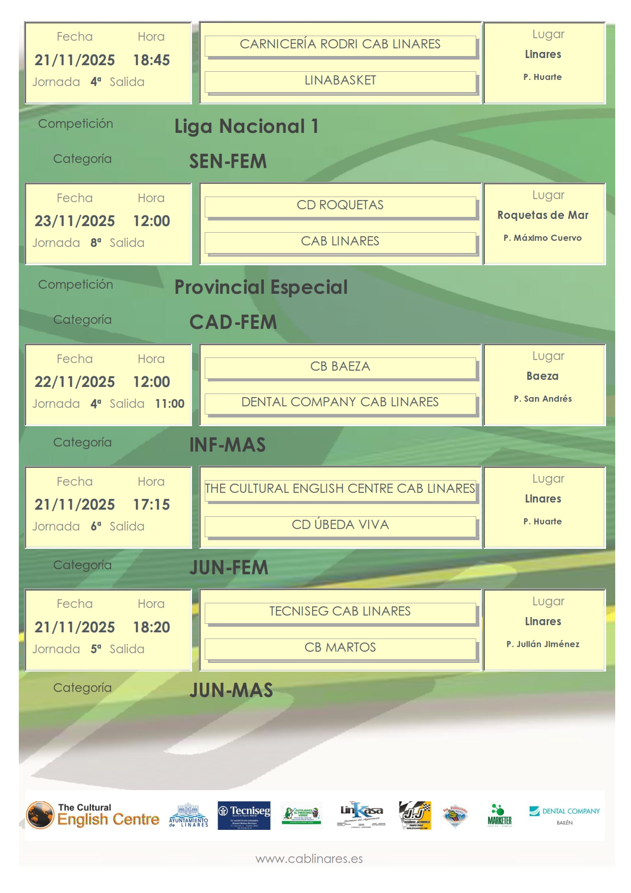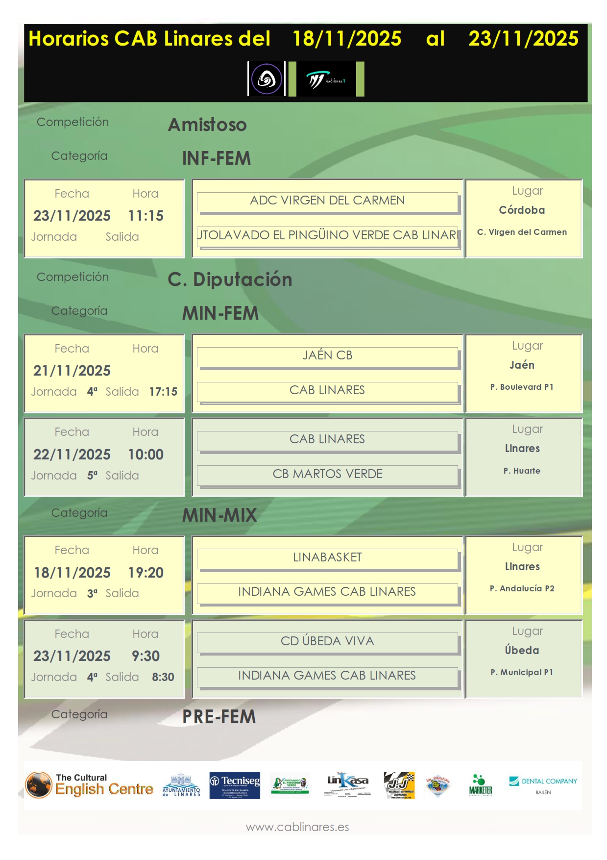 En la tarde del viernes el infantil masculino, The Cultural English Centre CAB Linares recibe a CD Úbeda Viva. A continuación el premini femenino, Carnicería Rodri CAB Linares disputa su partido de Copa Diputación ante Linabasket. El mini femenino se vuelve a desplazar a Jaén para disputar el encuentro que se suspendió la pasada semana a causa de la lluvia. El junior femenino, Tecniseg CAB Linares disputará su partido de la jornada en el Julián ante CB Martos.