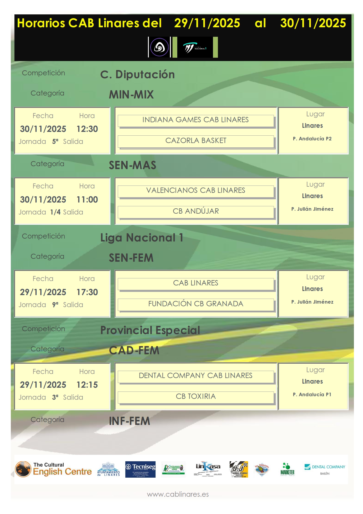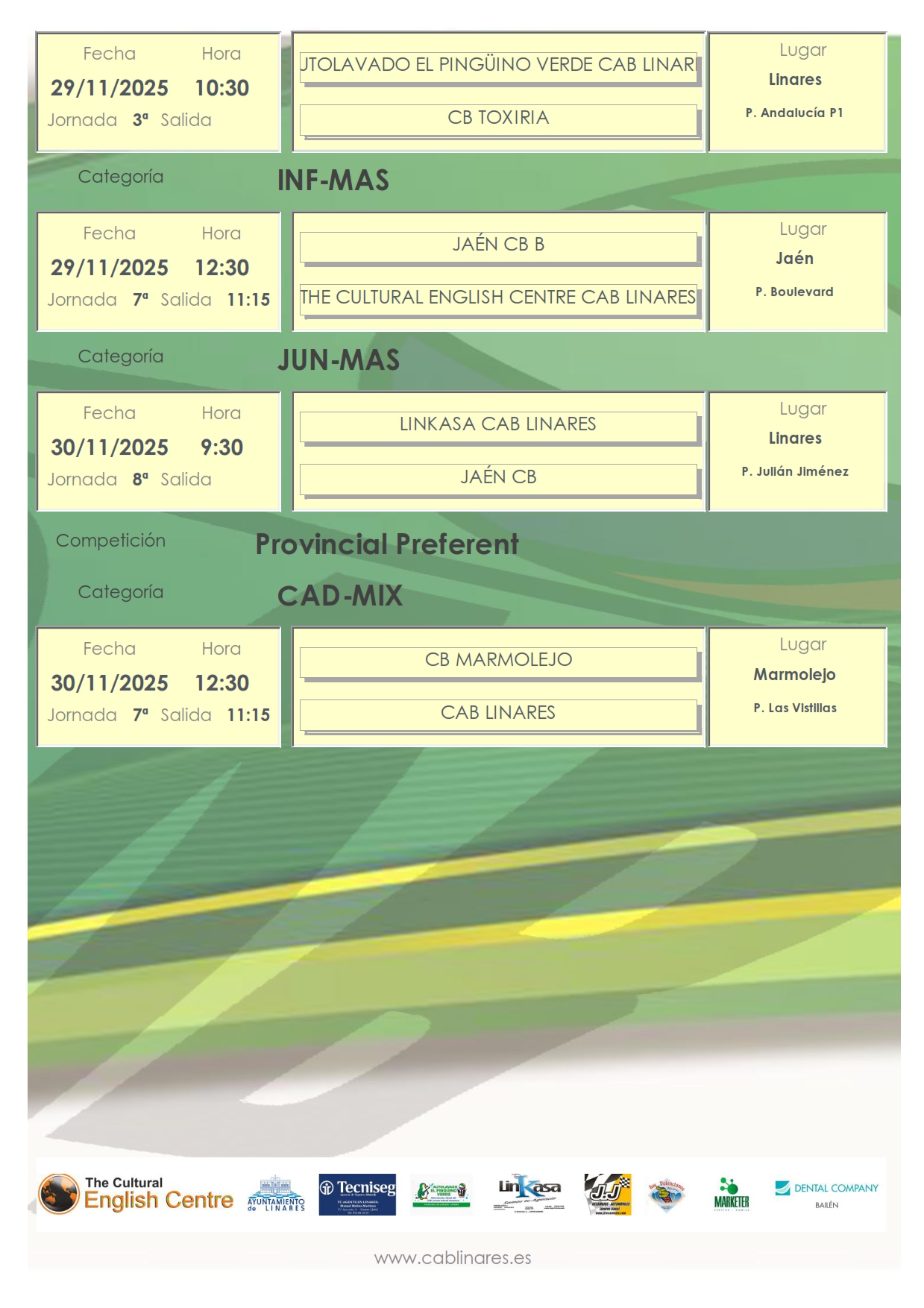 En la mañana del domingo el junior masculino Linkasa CAB Linares recibe la visita de Jaén CB. A continuación el senior masculino Valencianos CAB Linares disputa partido de cuartos de final de Copa Diputación ante CB Andújar. El cadete mixto visita la pista de CB Marmolejo y cierra la jornada el mini mixto, Indiana Games CAB Linares CAB Linares, que recibe en el Andalucía a Cazorla Basket.