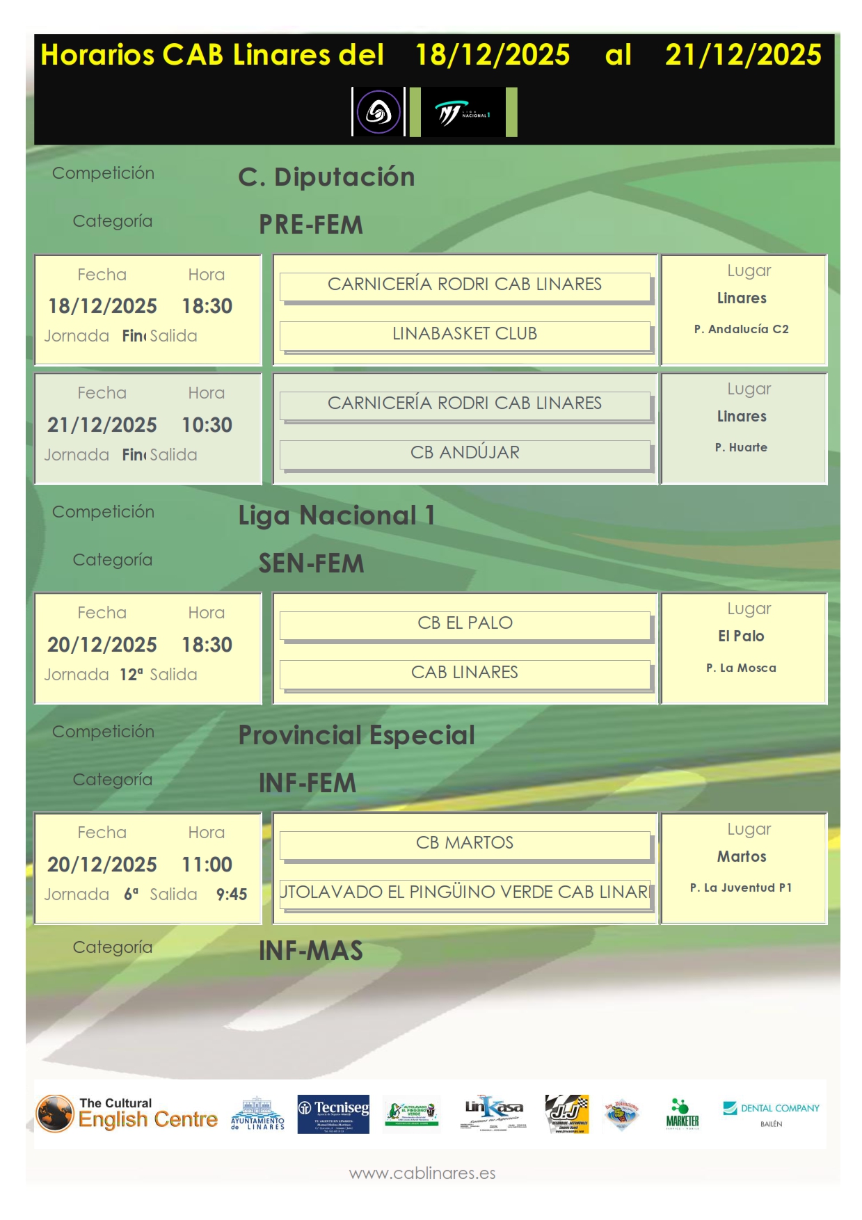 El sábado por la mañana el infantil masculino, The Cultural English Centre CAB Linares, viaja a Martos para disputar la novena jornada de liga provincial. A continuación el infantil femenino, Autolavado El Pingüino Verde CAB Linares se medirá con el conjunto marteño.