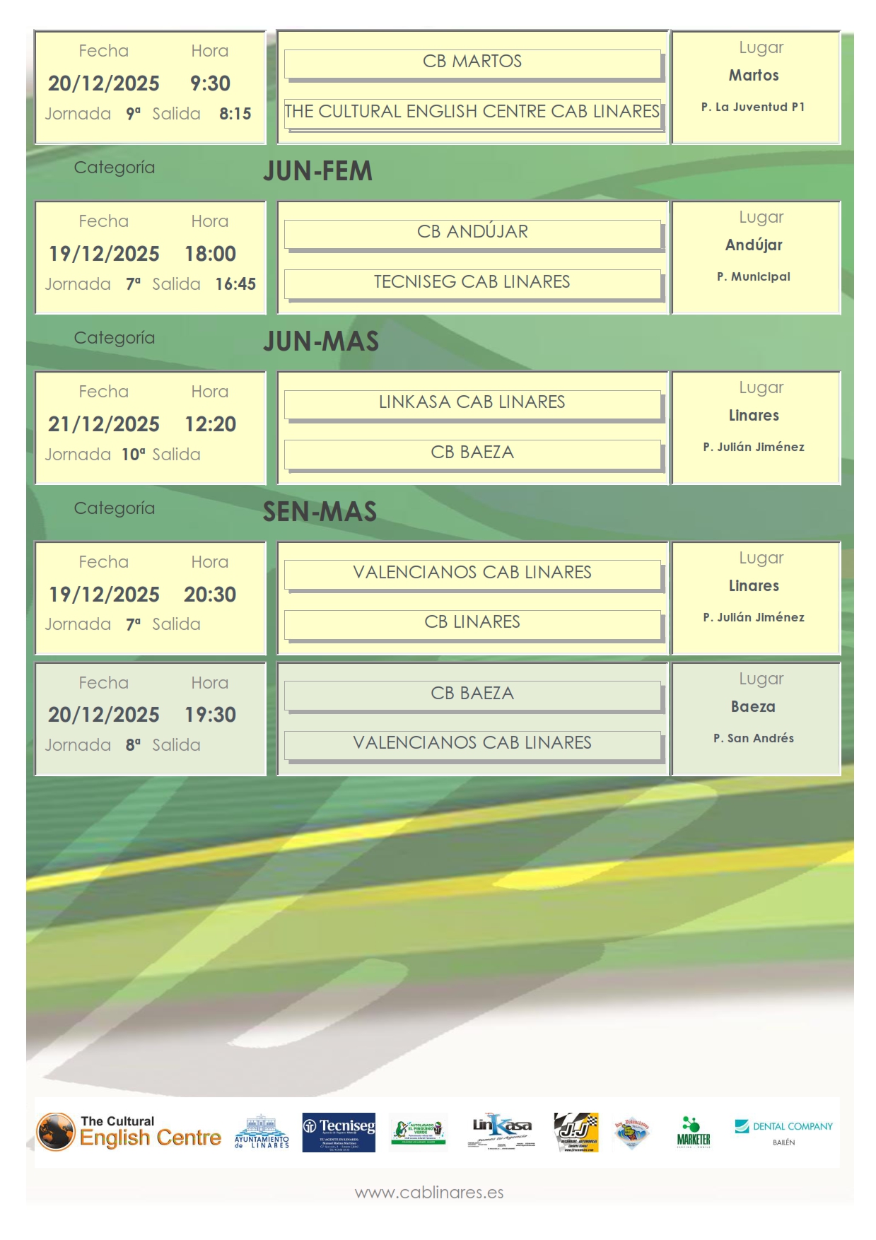 En la tarde del viernes el junior femenino, Tecniseg CAB Linares, se desplaza a Andújar para disputar su partido de liga provincial. El senior masculino Valencianos CAB Linares recupera su partido aplazado la pasada jornada con CB Linares.