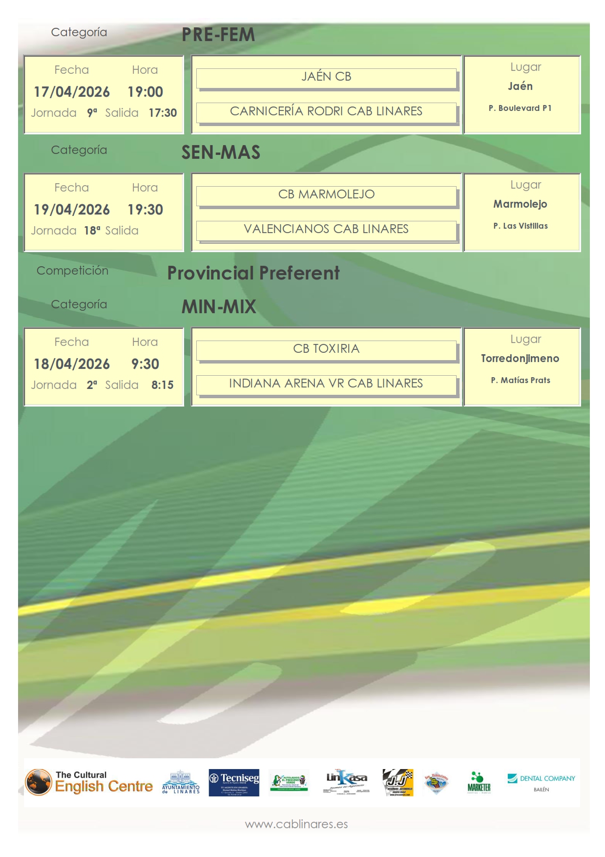 El mini preferente Indiana VR Arena CAB Linares se desplaza en la mañana del sábado a Torredonjimeno para disputar la segunda jornada de la fase por el título de la categoría. El infantil femenino Autolavado El Pingüino Verde CAB Linares hace su debut en Copa Diputación recibiendo en el Huarte a CD Úbeda Viva.