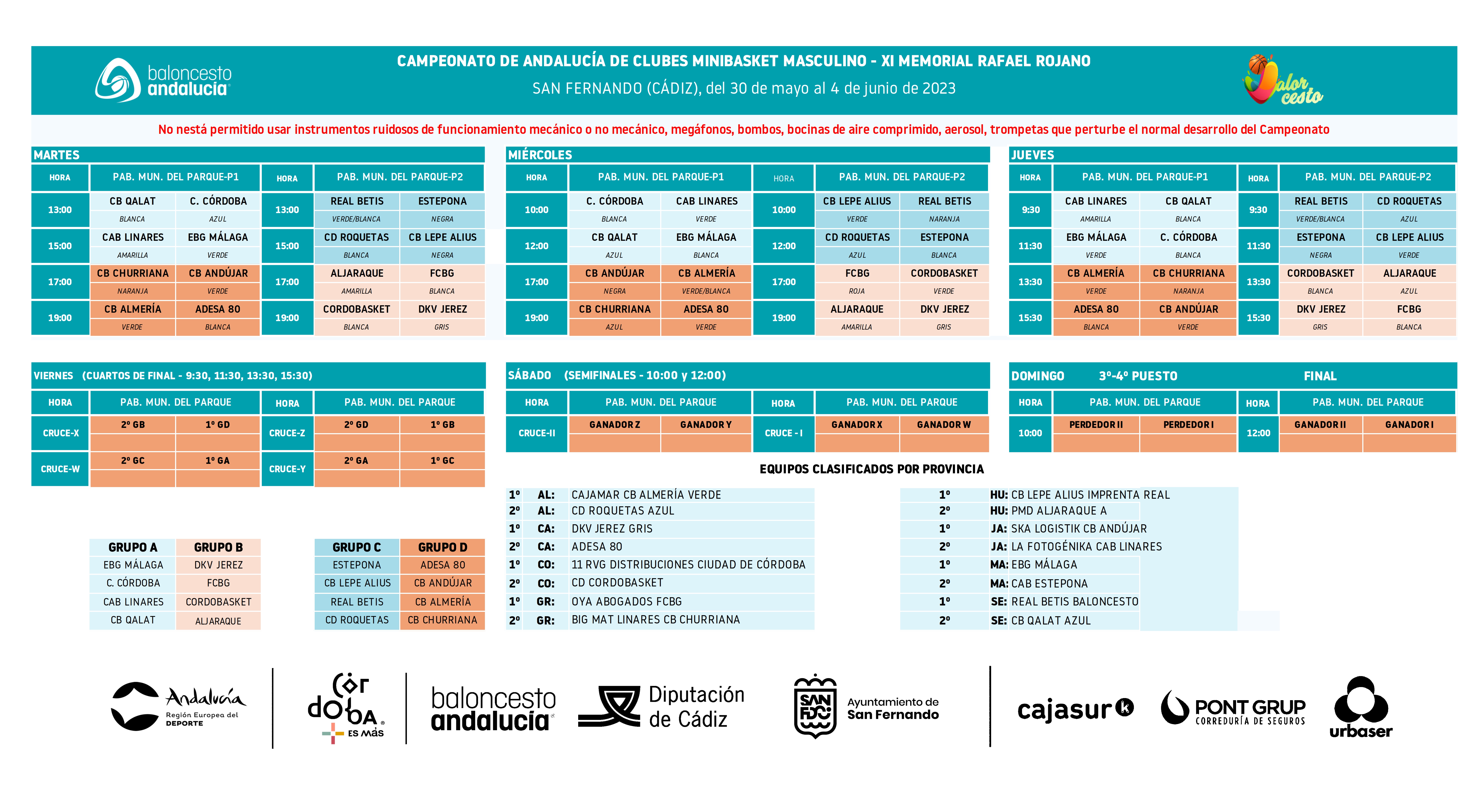 El equipo que dirigirán en este Campeonato J. Manuel Ruiz y Miguel A. de la Torre está encuadrado dentro del grupo A junto con el campeón malagueño EBG Málaga, el campeón cordobés Ciudad de Córdoba y el subcampeón sevillano CB Qalat. Debutarán a partir de las 15:00h ante el conjunto malagueño. En la jornada del miércoles el rival de turno será C. Córdoba y finalizarán el jueves la fase de grupos ante el equipo sevillano. En función de la clasificación obtenida en esta fase de grupos, a partir del viernes se disputarán las eliminatorias por el título. Todos los partidos se podrán seguir a través del canal FAB TV y de nuestra página web, donde estarán insertados los encuentros en nuestra página de inicio.