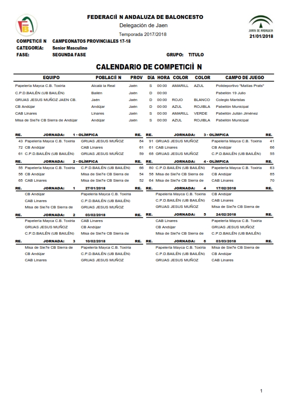 Tras la finalización de la primera fase de la competición, la Delegación Provincial de la FAB ya ha hecho público el calendario de competición de la segunda fase. Junto con CB Andújar y Sierra Andújar, equipos clasificados de nuestro grupo, se han clasificado Jaén CB, UB Bailén y CB Toxiria, que serán los rivales de nuestro equipo. Son válidos los resultados obtenidos en la primera fase con los equipos clasificados, por lo que teniendo esto en cuenta, nuestro equipo ocupa ahora mismo la cuarta posición de la clasificación, tras CB Andújar, con cero derrotas, Jaén CB y UB Bailén, ambos con una sola derrota arrastrada de la primera fase. Nuestro equipo pasa con dos derrotasy tras él se sitúan Sierra Andújar y CB Toxiria con cuatro derrotas.