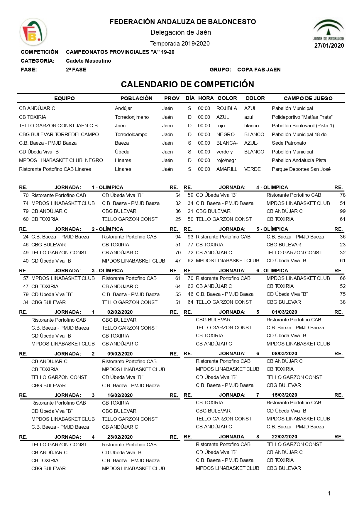 Una vez finalizada la primera fase de la competición provincial en la categoría cadete masculino, y no habiendo obtenido nuestro equipo Ristorante Portofino CAB Linares la clasificación para la disputa del título provincial, queda encuadrado en esta segunda fase en la denominada Copa FAB Jaén, que dará comienzo la próxima semana y que se disputará por sistema olímpico, en el que los resultados de los partidos disputados ya con los equipos que participan en esta fase están ya acumulados. Parte nuestro equipo por tanto con seis victorias y cero derrotas, encabezando la clasificación al inicio de la competición junto con el equipo C de CB Andújar.