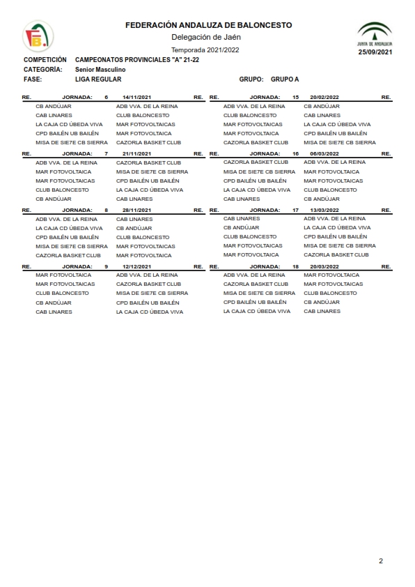 Nuestro equipo Valencianos CAB Linares está encuadrado dentro del grupo A junto a las escuadras de Villanueva de la Reina, Úbeda, Bailén, Andújar, Cazorla, Baeza y Linares. La competición da comienzo el primer fin de semana de octubre siguiendo el calendario que se adjunta a continuación.