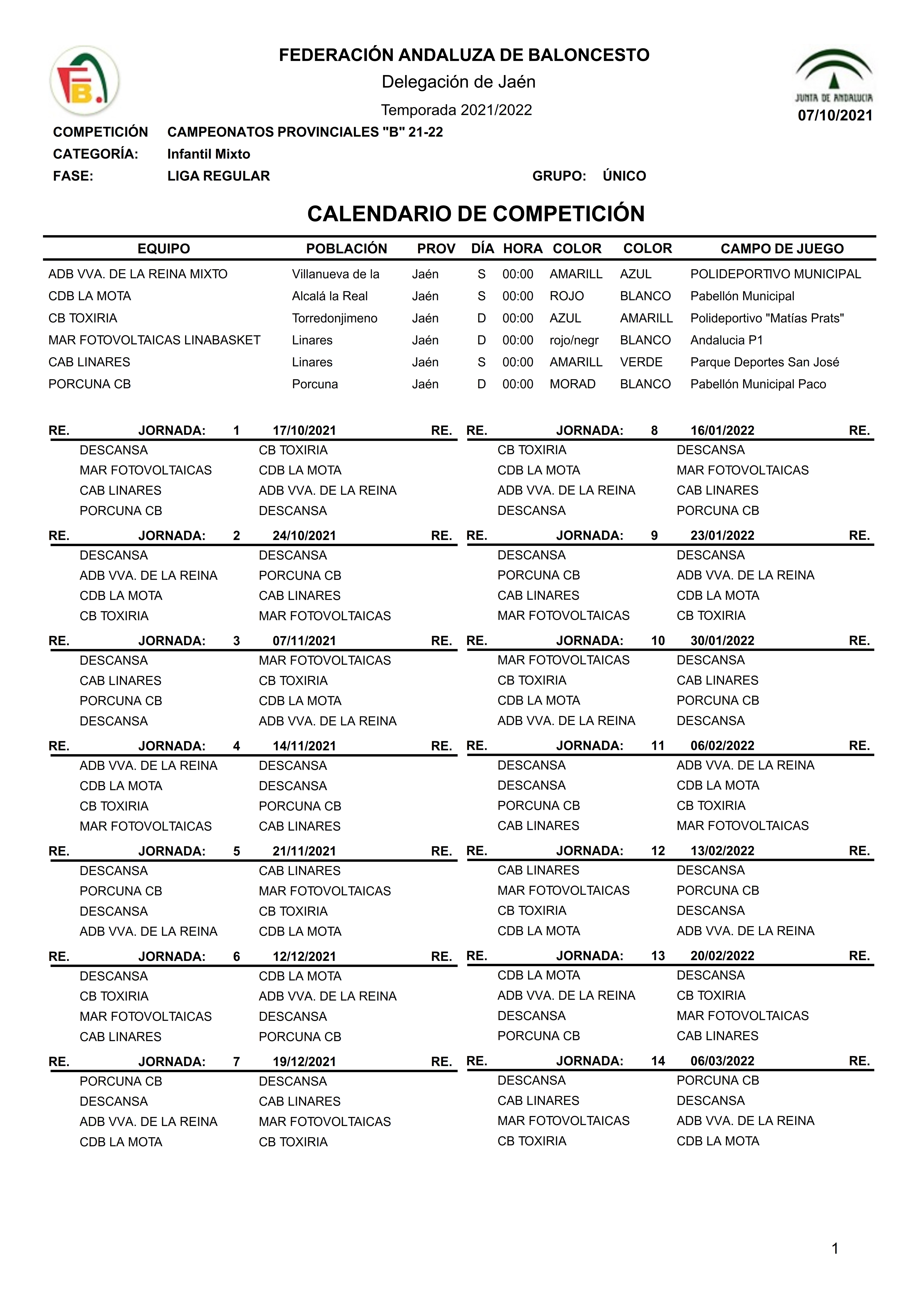 La Delegación Provincial de la FAB ha hecho público el calendario de juego de la categoría infantil mixto, en el que nuestro equipo Carnicería Rodri CAB Linares se medirá con los equipos de ADB Villanueva de la Reina, CDB La Mota de Alcalá La Real, CB Toxiria, Linabasket y Porcuna CB.