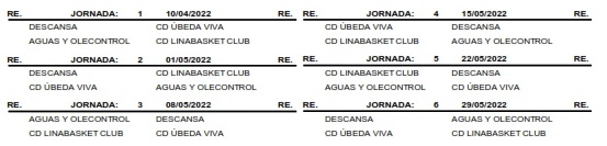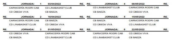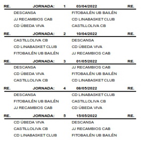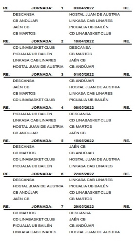 En senior femenino, con el nombre de Linkasa CAB Linares, nuestro equipo disputará liga a una sola vuelta con los conjuntos de CB Andújar, Jaén CB, Linabasket, UB Bailén, CB Martos y Baeza Baloncesto, con el siguiente calendario: