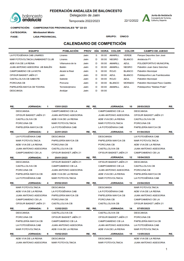 La Delegación Provincial de la FAB ha hecho público el calendario de juego de la fase regular de la Liga Provincial minibasket mixto en la que participará nuestro equipo La Fotogénika CAB Linares junto con otros ocho conjuntos de las localidade de Linares, Sabiote, Villanueva de la Reina, Porcuna, Torredonjimeno, Bailén, Alcalá La Real y Jaén.
