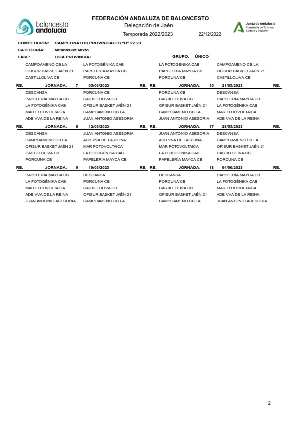 Calendario Liga Provincial Minibasket Mixto 22/23